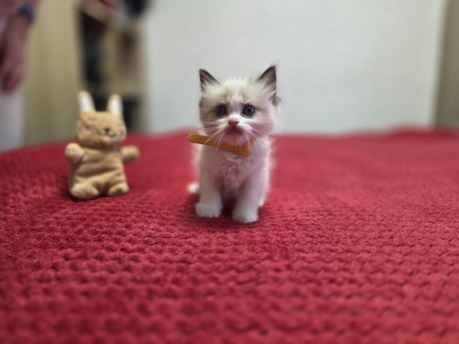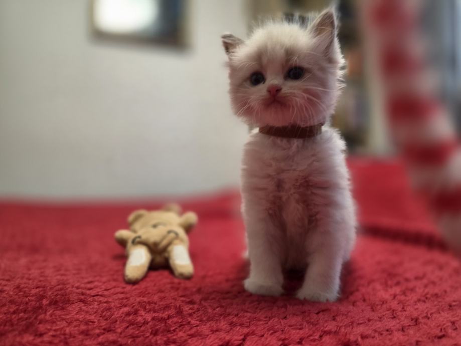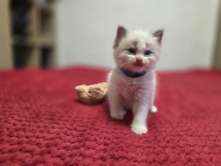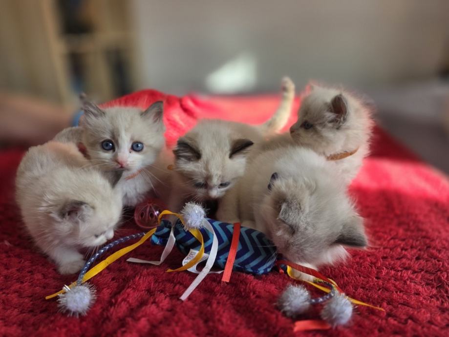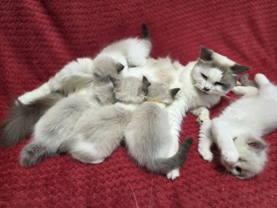 Prodajem Ragdoll mačiće, preslatka malena stvorenja koja odrastaju uz svoju majku. Mačići su bijelo-sive boje s karakterističnim Ragdoll markingama, mekanog i gustog krzna. Leglo broji više mačića različitih nijansi, od svjetlije do sivkaste boje.
