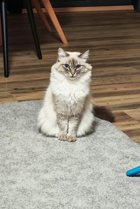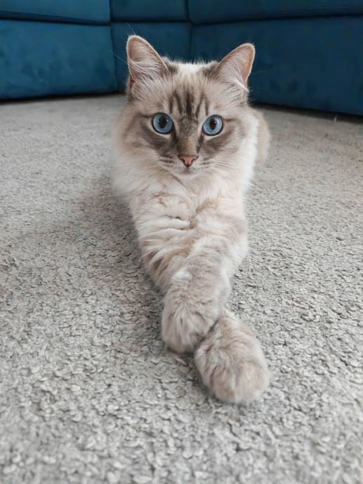 Predivna Ragdoll mačka s plavim očima i prekrasnom svilenkastom dlakom u bijelo bež-smeđim tonovima, stara 4 godine spremna je za novi dom.