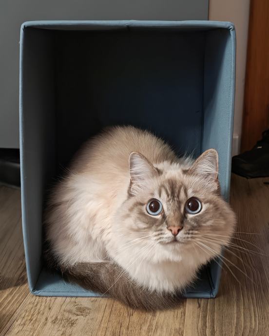 Mačka je umiljata, tipična za ovu pasminu, nema podlaku (kao perzijske) pa unatoč mekoj dugoj dlaci ne ispušta puno dlake. Nikada nije bila bolesna, hranjena je isključivo sa Premium hranom, sterilizirana je.