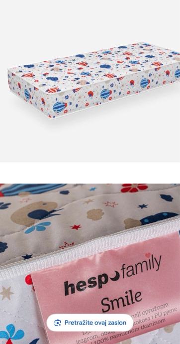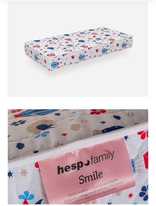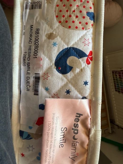 Hespo smile dječji madrac 120x60, visine 11 cm, madrac s Bonell opružnom jezgrom, oblogom od kokosa i PU pjene i 100% pamučnom tkaninom. Pogodan za kinderbet ili krevetić maksimalnih unutarnjih dimenzija dužine 122 cm i širine 62 cm. Madrac je u odličnom stanju, minimalno korišten. Uz madrac poklanjam nepropusnu navlaku.