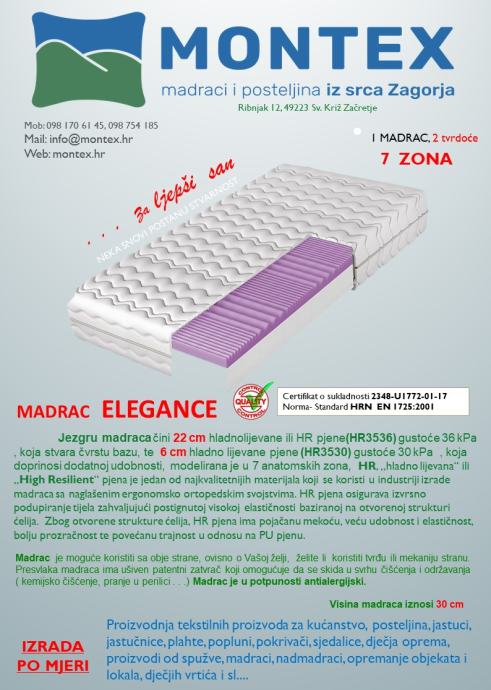 Jezgru madraca čini 22 cm hladnolijevane ili HR pjene(HR3536) gustoće 36 kPa , koja stvara čvrstu bazu, te 6 cm hladno lijevane pjene (HR3530) gustoće 30 kPa , koja doprinosi dodatnoj udobnosti, modelirana je u 7 anatomskih zona. HR, „hladno lijevana“ ili „High Resilient“ pjena je jedan od najkvalitetnijih materijala koji se koristi u industriji izrade madraca sa naglašenim ergonomsko ortopedskim svojstvima. HR pjena osigurava izvrsno podupiranje tijela zahvaljujući postignutoj visokoj elastičnosti baziranoj na otvorenoj strukturi ćelija. Zbog otvorene strukture ćelija, HR pjena ima pojačanu mekoću, veću udobnost i elastičnost, bolju prozračnost te povećanu trajnost u odnosu na PU pjenu. Madrac je moguće koristiti sa obje strane, ovisno o Vašoj želji, želite li koristiti tvrđu ili mekaniju stranu. Presvlaka madraca ima ušiven patentni zatvrač koji omogućuje da se skida u svrhu čišćenja i održavanja ( kemijsko čišćenje, pranje u perilici . . .)