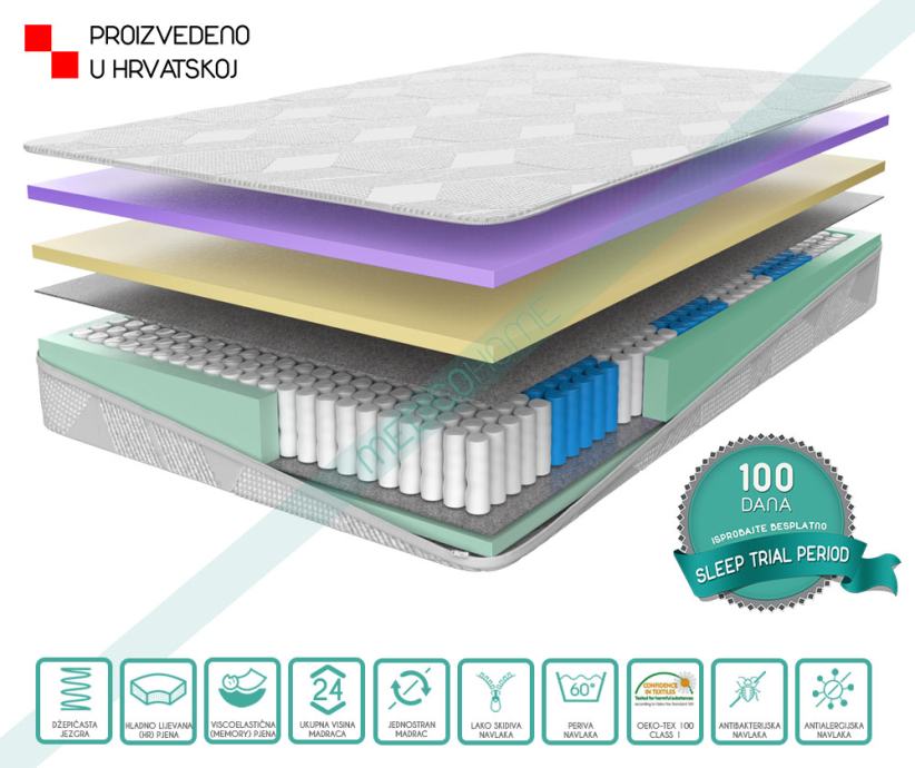 Madrac je napravljen u 7 zona udobnosti, jezgra madraca napravljena je od džepićastih opruga, na džepićastoj opruzi nalazi se sloj elastične i prozračne HR (hladno lijevane) pjene u visini od 3 cm, a završan sloj madraca čini memorijska pjena koja Vam pruža udobnost i visoku kvalitetu sna, također u visini od 3 cm.