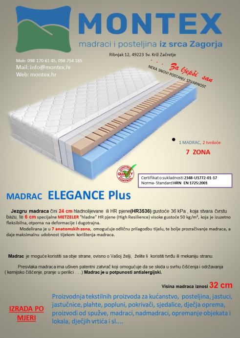Jezgru madraca čini 24 cm hladnolijevane ili HR pjene(HR3536) gustoće 36 kPa , koja stvara čvrstu bazu, te 6 cm specijalne METZELER “hladne” HR pjene (High Resilience) visoke gustoće 50 kg/m³, koja je izuzetno fleksibilna, otporna na deformacije i dugotrajna. Modelirana je u 7 anatomskih zona, omogućuje odličnu prilagodbu tijelu, te bolje prozračivanje madraca, a daje maksimalnu udobnost tijekom korištenja madraca. Madrac je moguće koristiti sa obje strane, ovisno o Vašoj želji, želite li koristiti tvrđu ili mekaniju stranu. Presvlaka madraca ima ušiven patentni zatvrač koji omogućuje da se skida u svrhu čišćenja i održavanja ( kemijsko čišćenje, pranje u perilici . . .) Madrac je u potpunosti antialergijski.