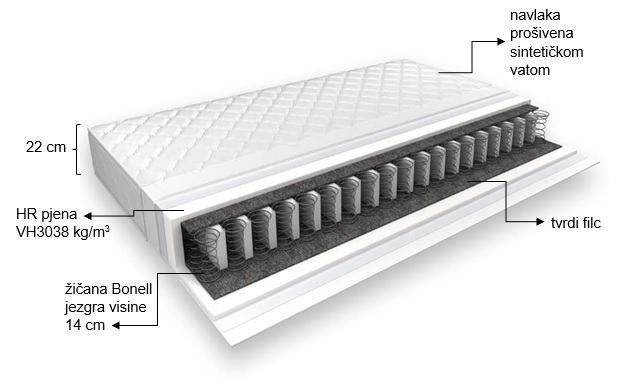 Visina madraca je 22 cm. Jezgru madraca čini Bonell opružna jezgra visine 14 cm. Madrac je obložen tvrdim filcom 700 g/m² za ravnomjernu raspodjelu težine i HR pjenom VH3038 kg/m³ za odlično podupiranje cijelog tijela. Navlaka je prošivena sintetičkom vatom 200 g/m², antibakterijska i antialegrijska te periva. Tvrdoća madraca je H2, što označava da je madrac srednje tvrd.