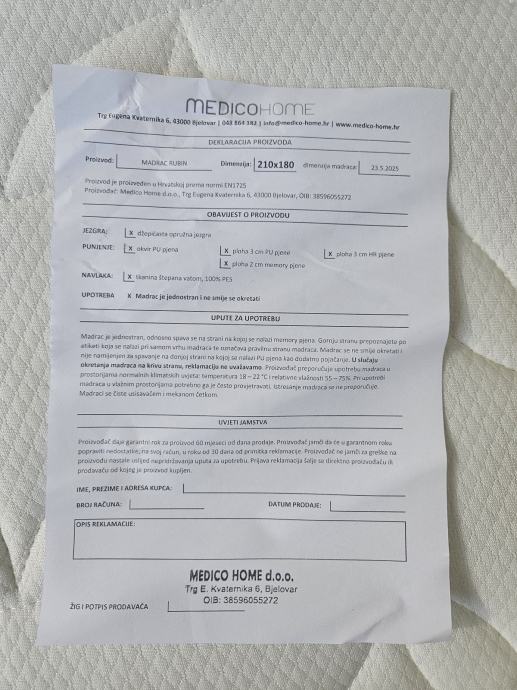 Medico Home RUBIN madrac 180×210 kupljen u svibnju 2025.