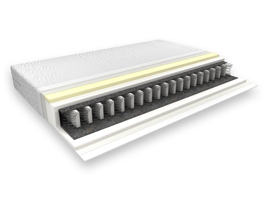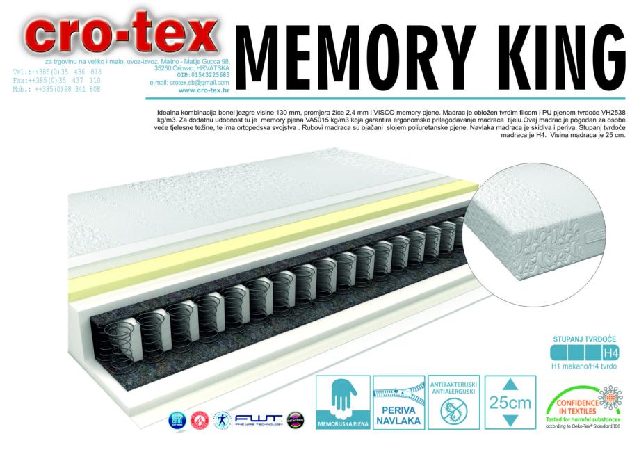 MEMORY KING - Idealna kombinacija bonel jezgre visine 130 mm, promjera žice 2,4 mm i VISCO memory pjene. Madrac je obložen tvrdim filcom i PU pjenom tvrdoće VH2538 kg/m3. Za dodatnu udobnost tu je memory pjena VA5015 kg/m3 koja garantira ergonomsko prilagođavanje madraca tijelu.Ovaj madrac je pogodan za osobe veće tjelesne težine, te ima ortopedska svojstva . Rubovi madraca su ojačani slojem poliuretanske pjene. Navlaka madraca je skidiva i periva. Stupanj tvrdoće madraca je H4. Visina madraca je 25 cm.