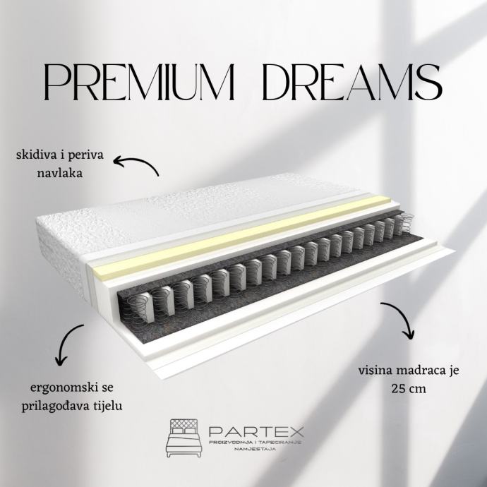 PREMIUM DREAMS je idealna kombinacija bonel jezgre visine 130 mm, promjera žice 2,4 mm i VISCO memory pjene.
