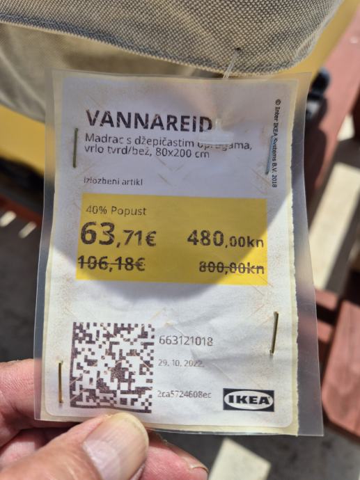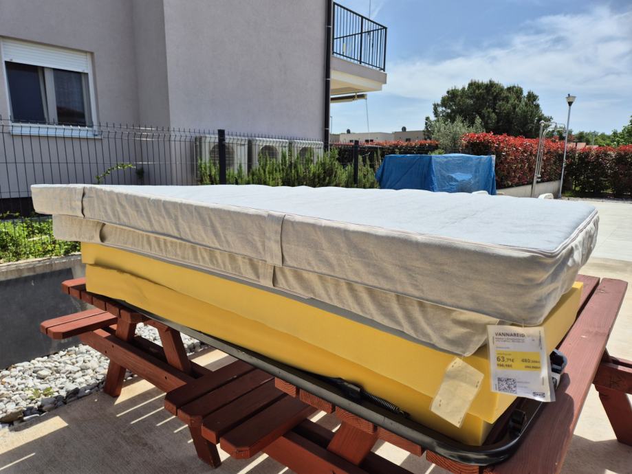 Prodajem 2 potpuno NOVA, nikad korištena vrlo tvrda IKEINA madraca sa džepičastim oprugama bež boje, dimenzija 80x200 cm trgovačkog naziva VANNAREID. Cijena po komadu 60 eura (trenutna cijena u IKEI 110 eura po komadu!) Cijena za oba 110 eura! Izuzetna prilika za iznajmljivače zbog svoje kvalitete izrade (čvrstoća i postojanost). Poreč. Moguća lokalna dostava uz prethodni ogled. tel 091 461 46 21.