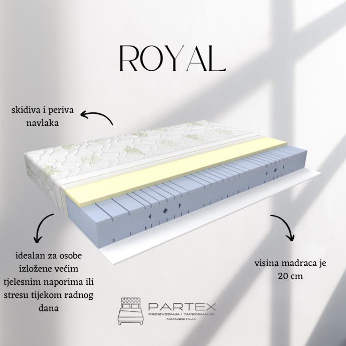 ROYAL madrac sastoji se od dvije vrste visokokvalitetnih pjena što ga čini idealnim za osobe izložene većim tjelesnim naporima ili stresu tijekom radnog dana.