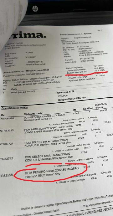 Krevet kupljen 19.7.2025. u Primi, s njim sam dobio i madrac. Krevet je dostavljen 17.9.2025. Prodajem madrac jer koristim 2 madraca od 90x200 s toga mi ovaj veliki ne odgovara.