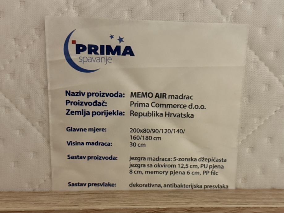 Poklanjam korišteni madrac Prima Memo Air, dimenzija 180×200 cm, visine 30 cm. Madrac je star 6 godina. Mekši je i zbog korištenja ima blaga udubljenja na obje strane, pa nije idealan za nekoga tko voli tvrđe madrace ali je još uvijek upotrebljiv i mogao bi odlično poslužiti nekome kome treba mekši ležaj ili si trenutno ne može priuštiti novi.