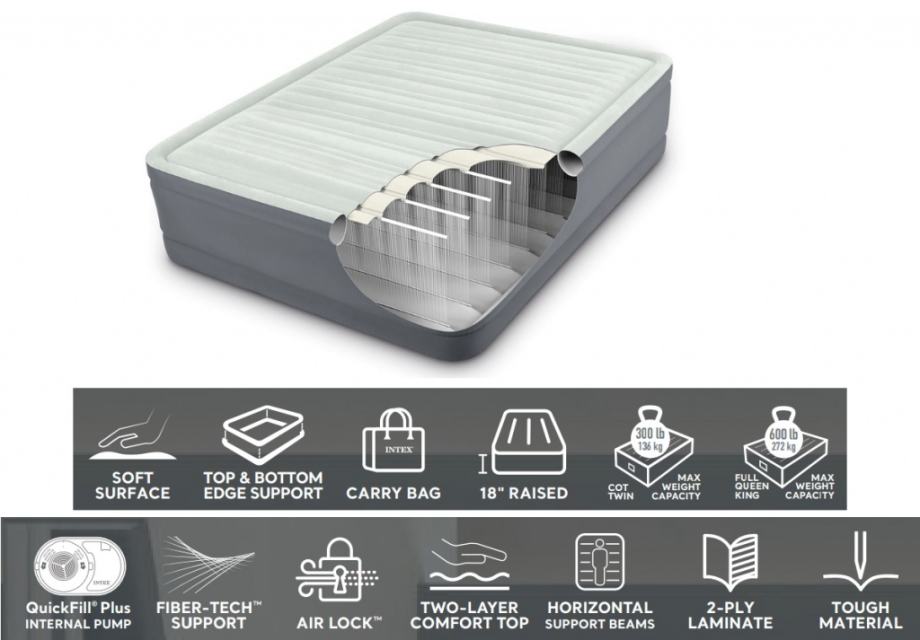 Novi Intex PremAire® madrac na napuhavanje izrađen je od Intexove patentirane Fiber-Tech® konstrukcije koja pruža vrhunsku stabilnost i potporu tijekom spavanja. Vlakna visoke čvrstoće pružaju nevjerojatnu izdržljivost i neusporedivu udobnost. Dno i stranice madraca izrađene su od laminiranog PVC-a koji pruža otpornost na probijanje. Gornji dio madraca sastoji se od zračnih džepova koji omogućuju glatko i postupno strujanje zraka preko površine za izvrsno iskustvo spavanja. Ugrađena pumpa puni krevet za manje od 4 minute.Dimenzije: 131 x 191 x 46 cmPodignut od poda za udobno spavanjePogodan za 2 osobeŠifra: 64904Fiber-Tech zgradaBaršunasto mekana gornja površinaPriložena je torba za jednostavno skladištenje i transportSnažna ugrađena pumpa za brzo punjenje i pražnjenjeVrijeme napuhavanja: dobre 4 minuteKomplet za popravak uključen.Maksimalna nosivost: 272 kgTežina: 8 kg