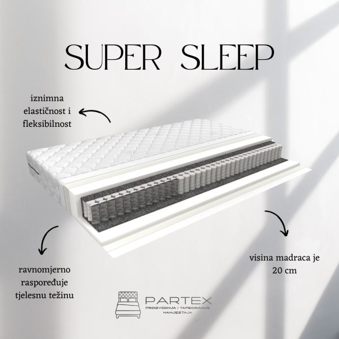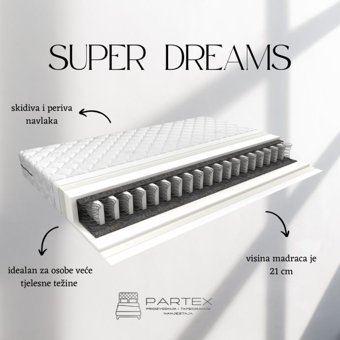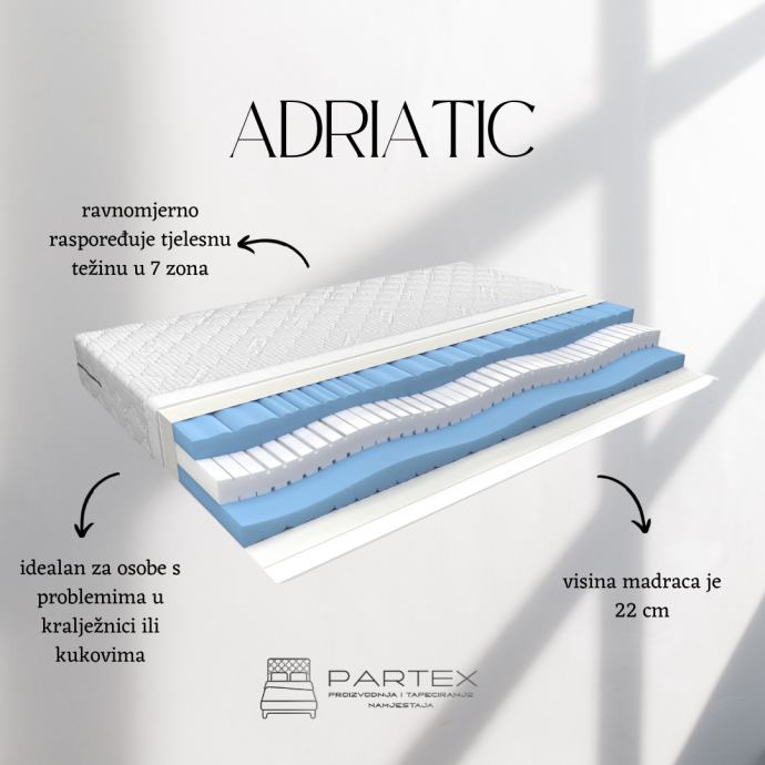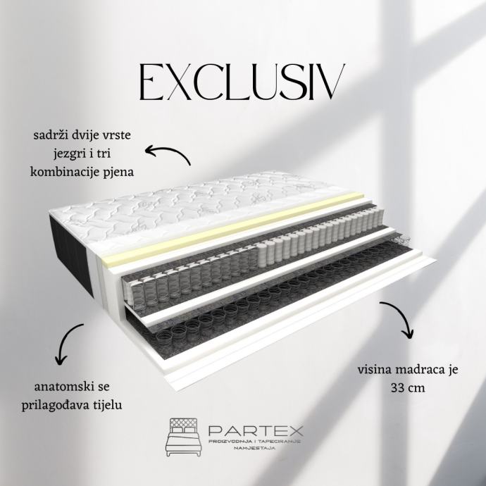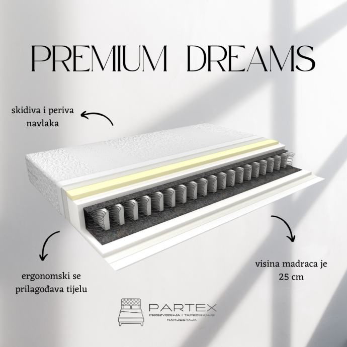 Vrhunski madraci izrađeni od bonel i džepičastih jezgri u sedam zona,visokokvalitetnih pjena obloženi Visco Memory pjenom, obučeni u antialergijsku navlaku. Visina madraca od 17 cm do 33 cm. Madraci raznih tvrdoća.