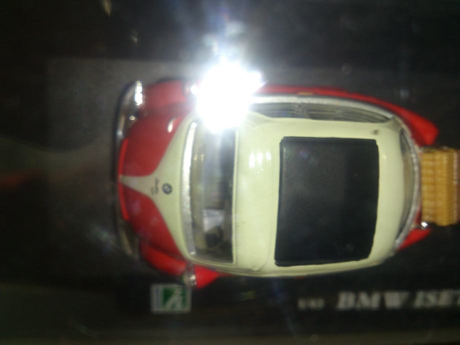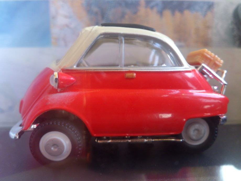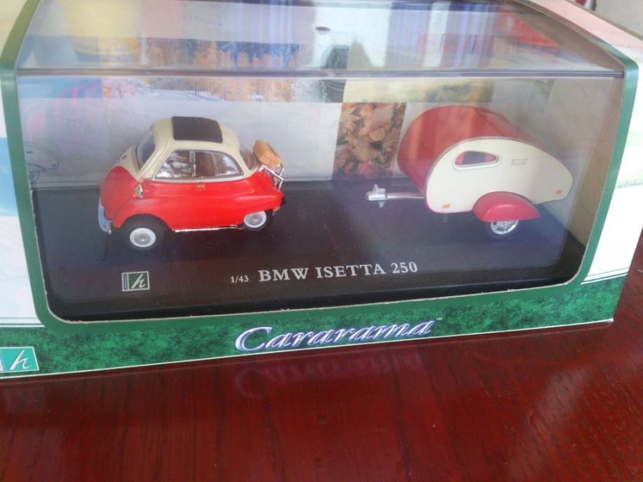 Model BMW Isetta 250 od Cararama u mjerilu 1/43, s kutijom i pripadajućim postoljem.