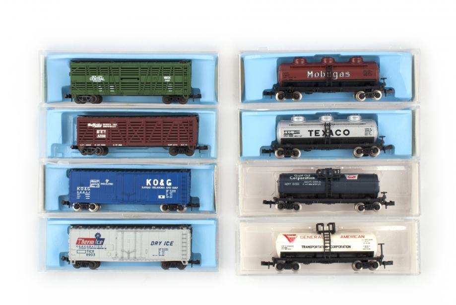 Dva lota (seta/kolekcije) po četiri modela željezničkih teretnih vagona i četiri željeznička vagona cisterni, različitih željezničkih i nafnih kompanije iz SAD-a.