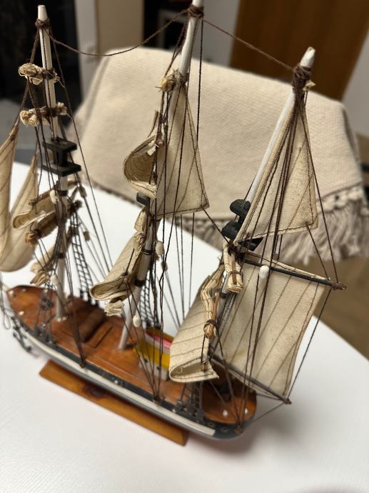 Jedrilica brod od drveta sa jedrima, u stanju kako se vidi na slici. Sve je od prirodnog matrijala, ostalo od dide živio na moru.
