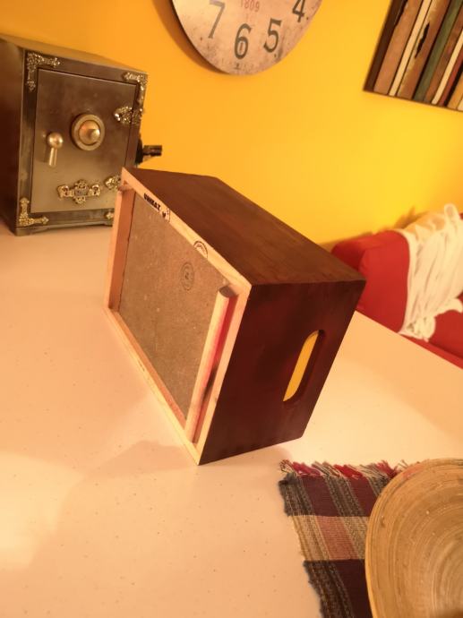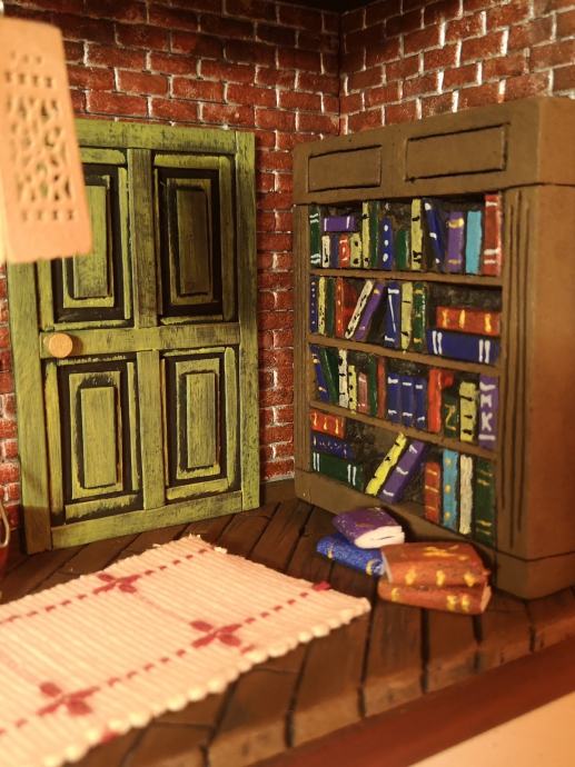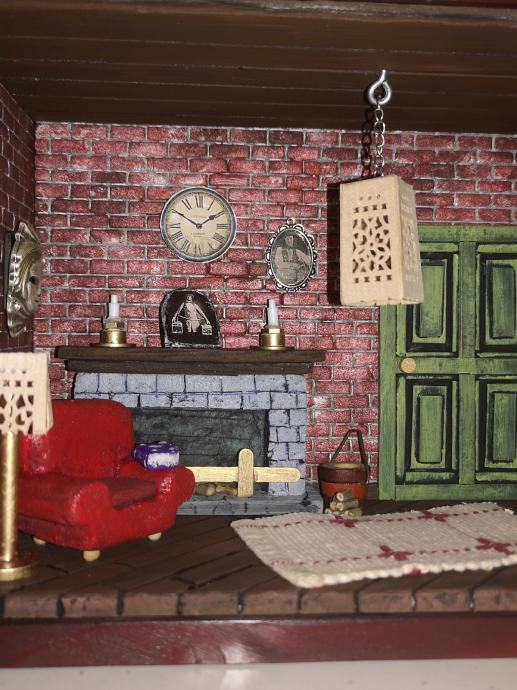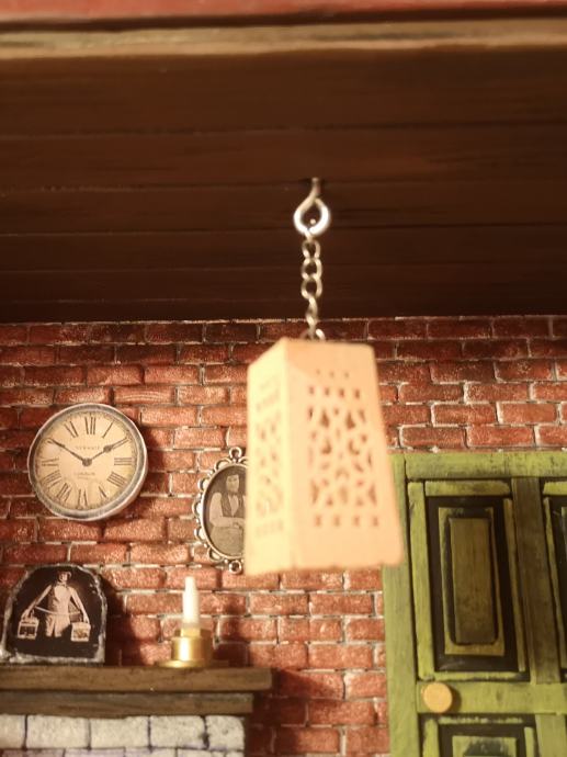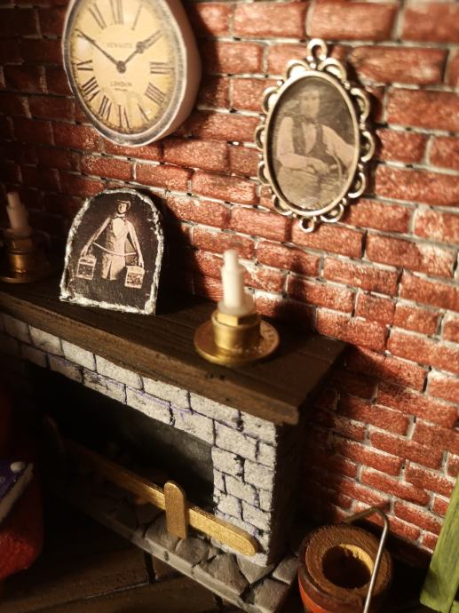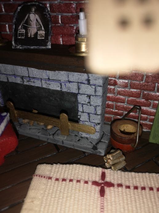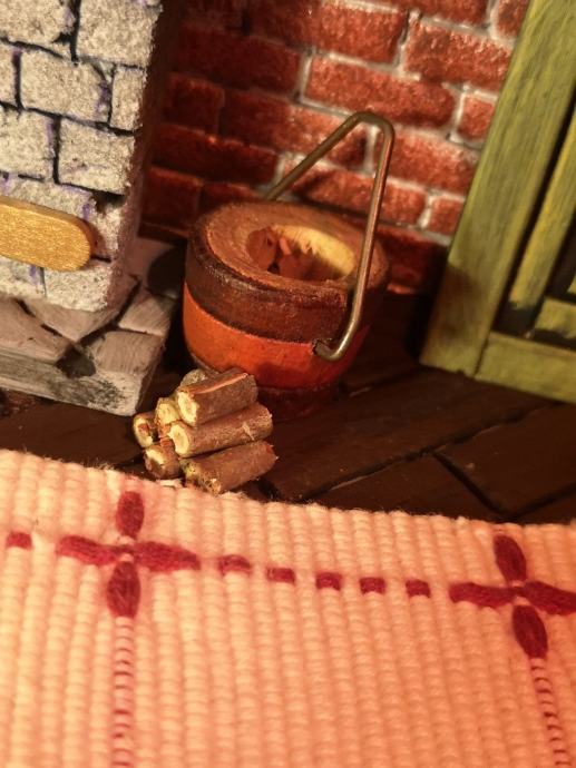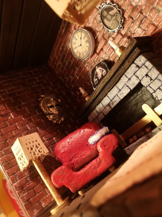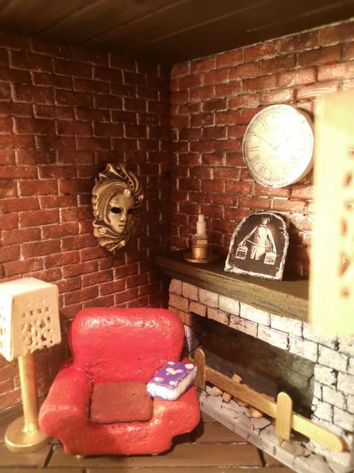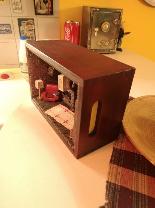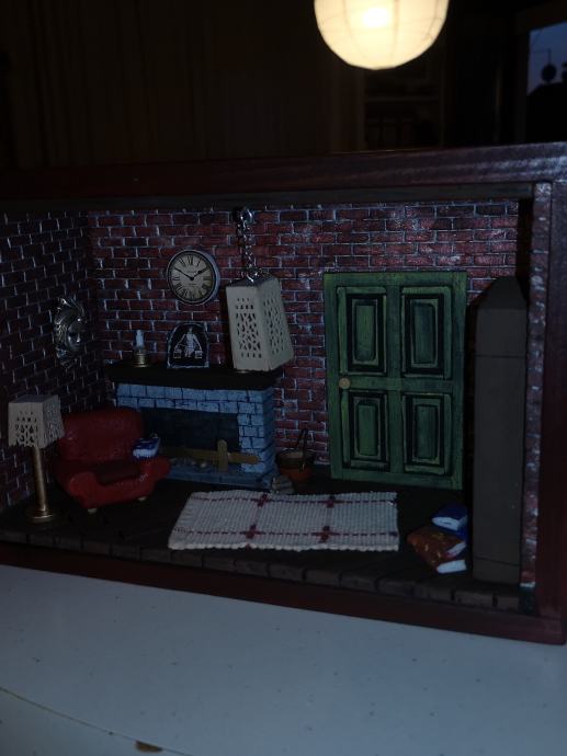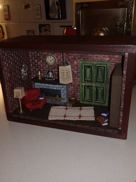 Dimenzije v 20 x š 30 x d 13,5 cm. Diorama sobe sa kaminom u drvenoj gajbi. Biblioteka, kamin, drvena vrata. Ručni rad, unikat. Dekoracija za kuću, za poklon. Minijatura. Ukras. Maketa.Ne šaljem pouzećem