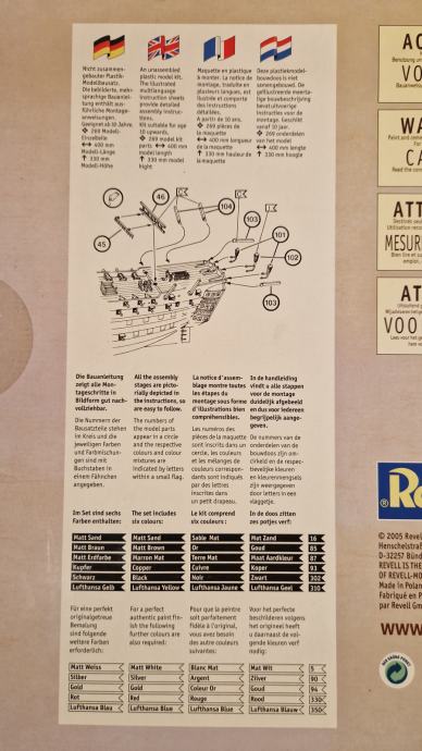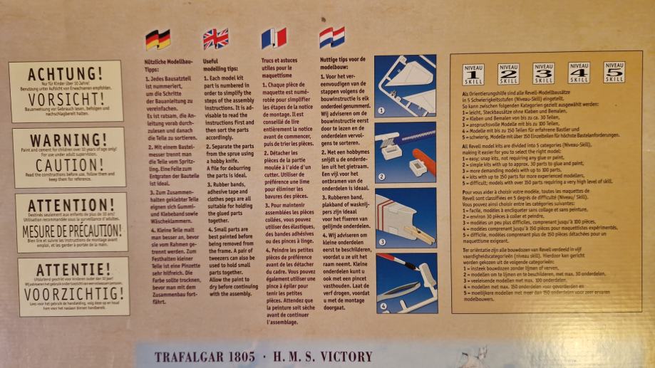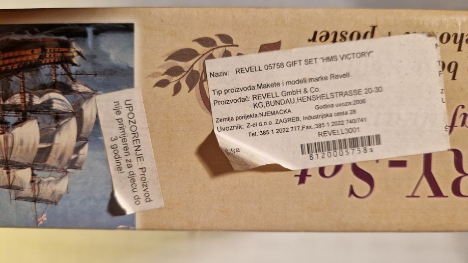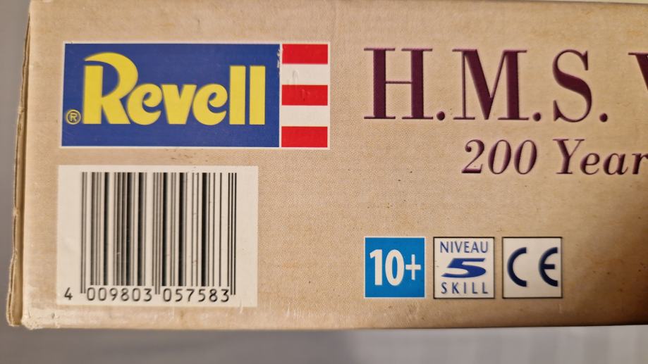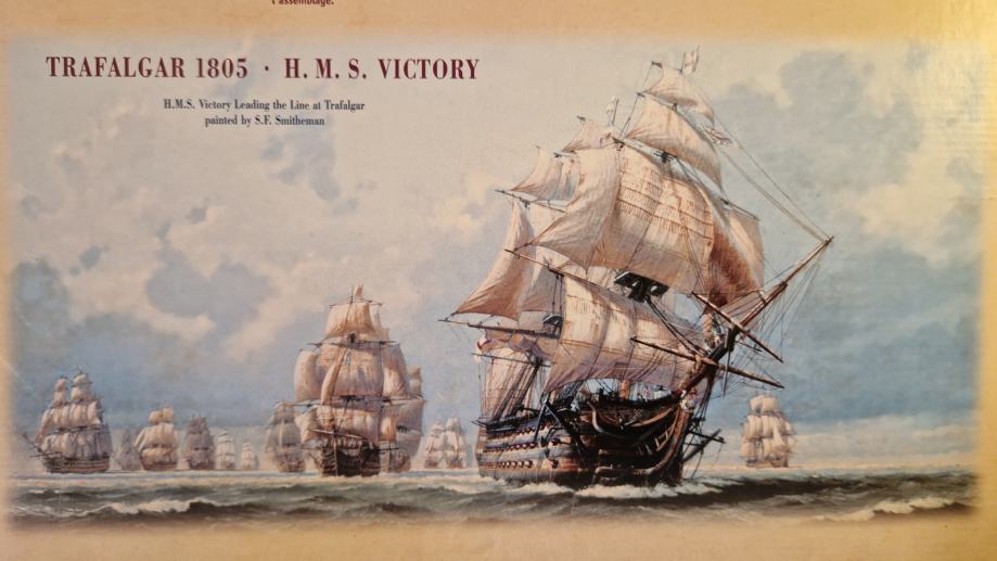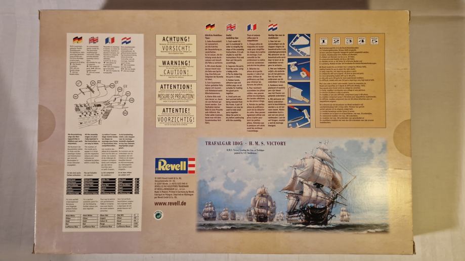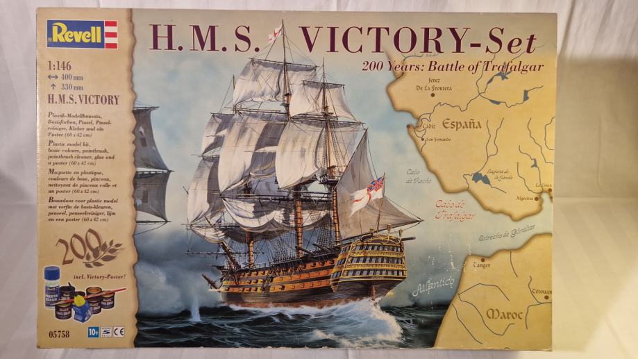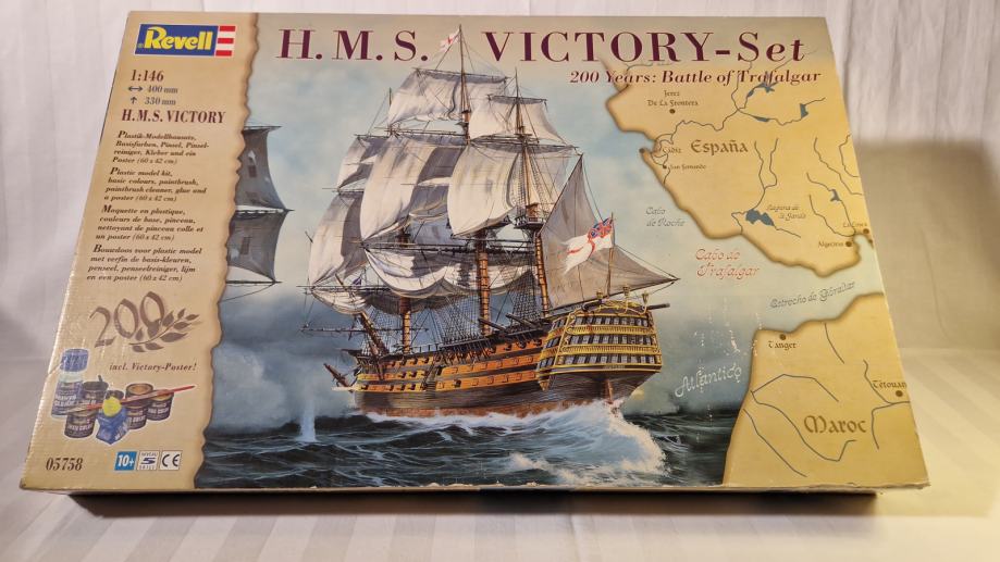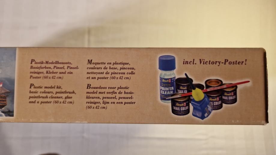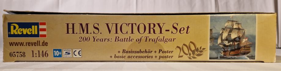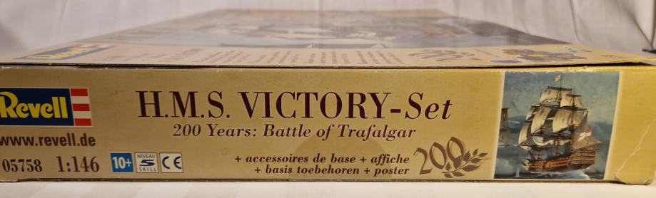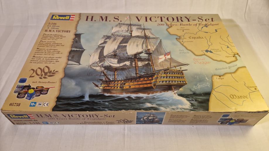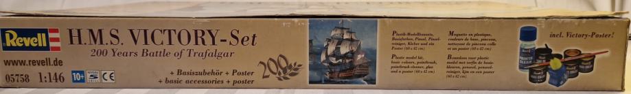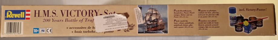 Set za sklapanje makete H.M.S. Victory, zapovjednog broda admirala Horatia Nelsona u bitci kod Rta Trafalgar, dolazi u originalnom stanju, u neotvorenoj kutiji. Maketu broda načinio je legendarni Revell u povodu 200. obljetnice pobjede britanske flote nad Napoleonovom. U bitci je poginuo admiral Nelson, a legenda kaže da su njegovo tijelo očuvali do Londona tako što su ga uronili u bačvu s rumom. U kutiji se, uz dijelove makete, ljepilo, osnovne boje i airbrush, nalazi i poster bitke, velilčine 60 x 42 cm.