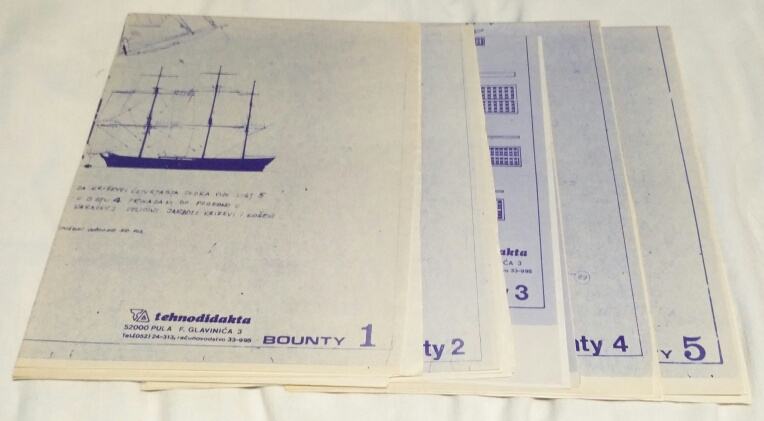Komplet nacrta za izradu jedrenjaka HMS Bounty, izrađenih od Tehnodidakte iz Pule, iz vremena Jugoslavije. Nacrti su na pet listova veličine A0, odlično očuvani, nikad korišteni.