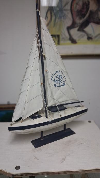 Dekorativni model jedrenjaka visine 52 cm. Radi se o drvenom jedrenjaku u mornarsko plavoj i bijeloj boji, s tekstilnim jedrima na kojima piše "Welcome Aboard" uz motiv sidra. Dolazi s postoljem pa ga je lako izložiti na polici, komodi ili stolu. Lijepa nautička dekoracija koja donosi ugođaj mora u svaki prostor. Mogucnost dostave do Zagreba.