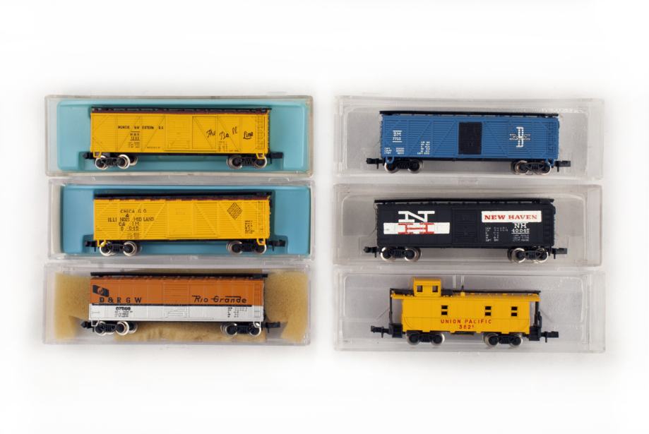 Lot (set/kolekcija) od šest modela željezničkih teretnih vagona, različitih željezničkih kompanija iz SAD-a.
