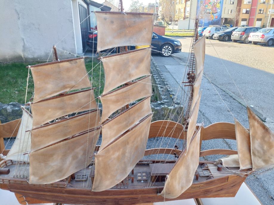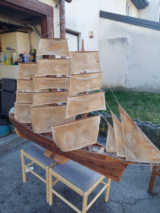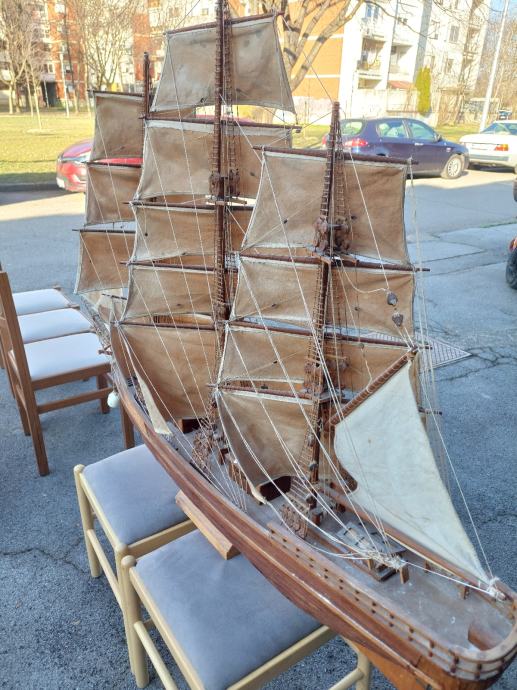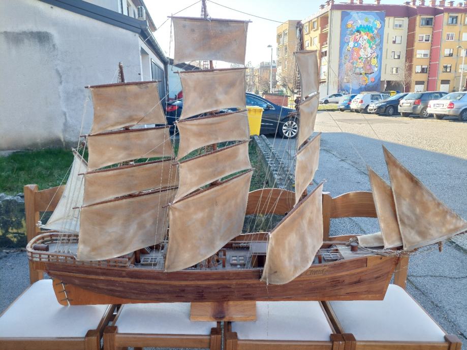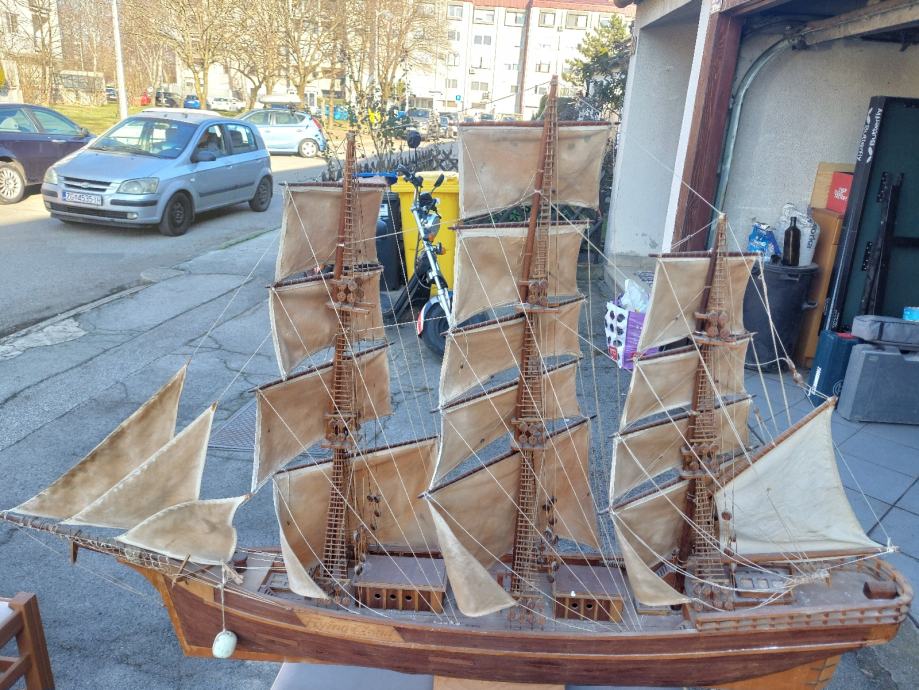 Prodajem maketu drvenog jedrenjaka staru 40 godina.Duljina jedrenjaka je cca 110cm,a visina cca 90cm.Napravljena je prema stvarnom jedrenjaku imenom Flying Claud iz 1851 . godine.Na maketi su se pokidala 2 konopa na jedrima.