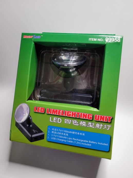Prodajem Master Tools / Trumpeter LED Limelighting Unit (šifra 09958), specijalno LED svjetlo za osvjetljavanje maketa, vitrina ili fotografiranje modela. U originalnoj kutiji, komplet izgleda nekorišteno. Glava reflektora se okreće, a svjetlo ima više boja i ugrađenu punjivu bateriju.
