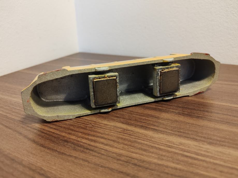 Jednodijelni aluminijski odljev opremljen s dva magneta koji ga drže na nagnutoj ravnini.