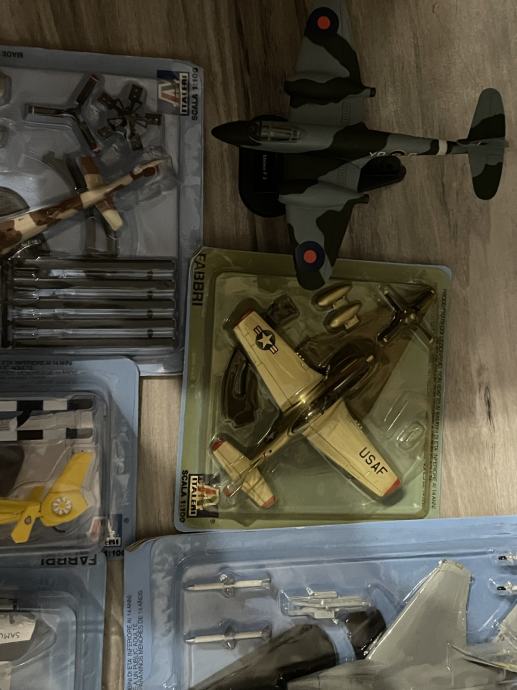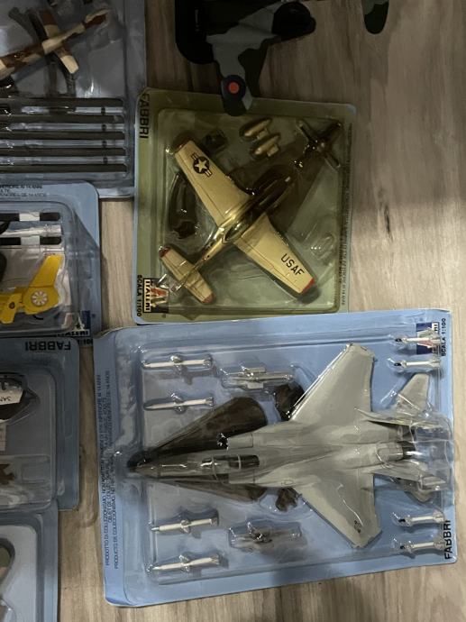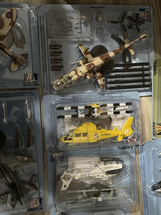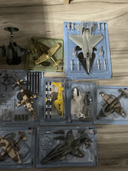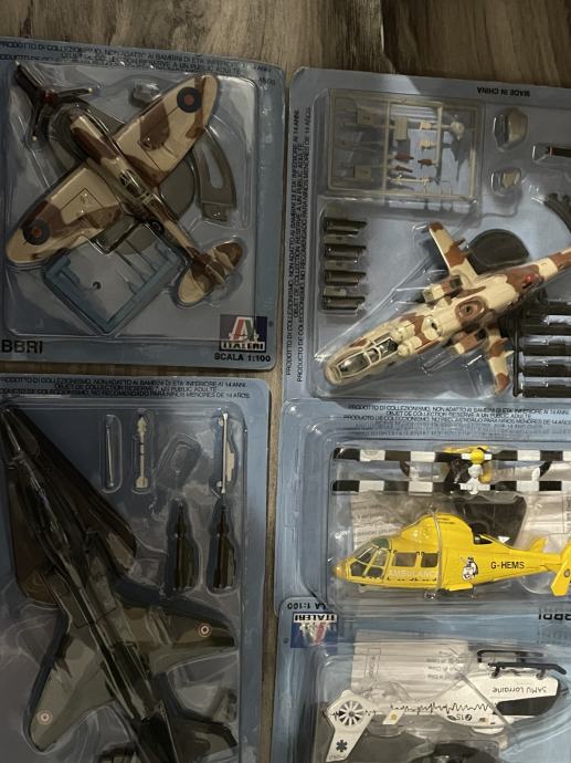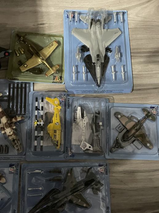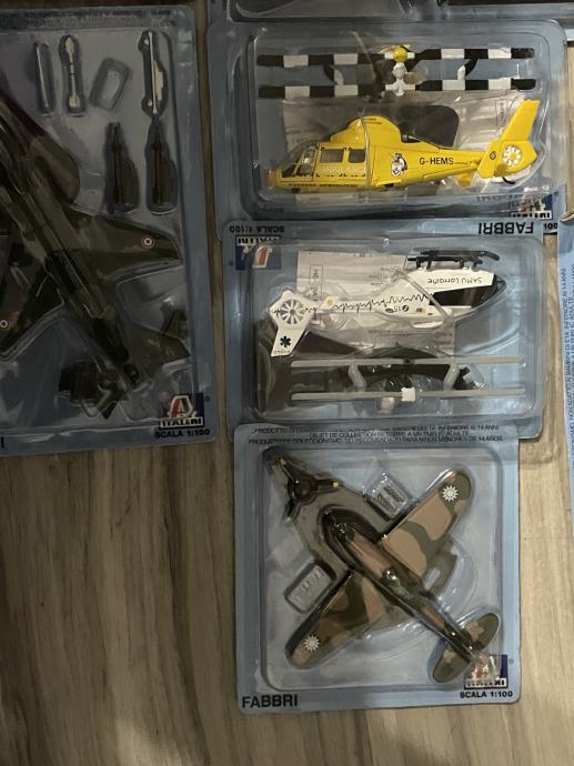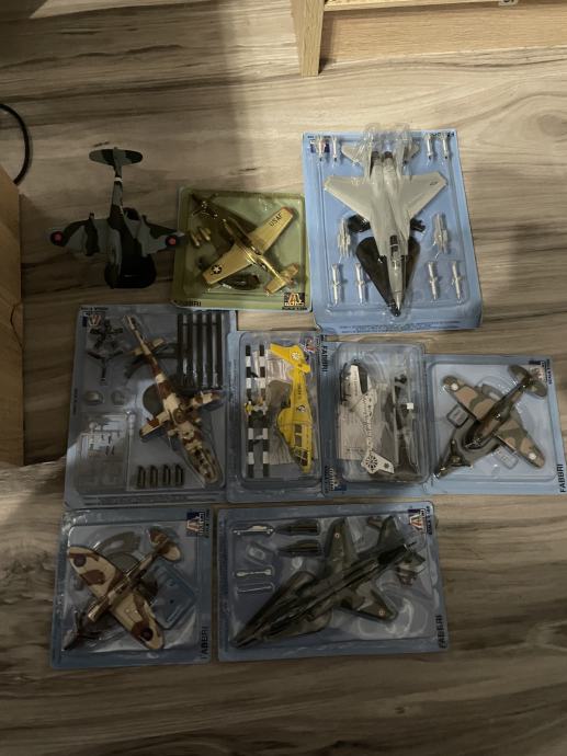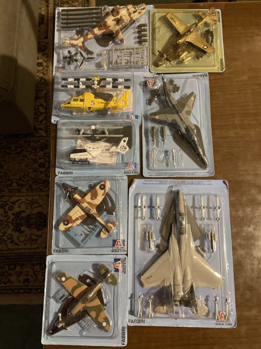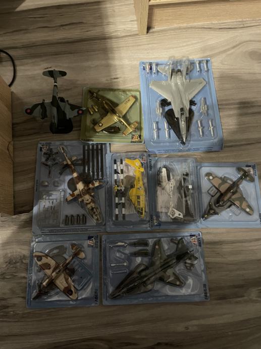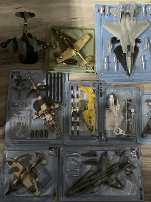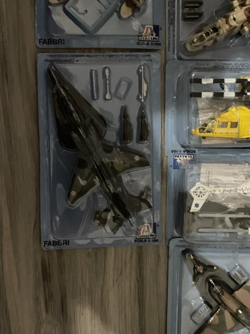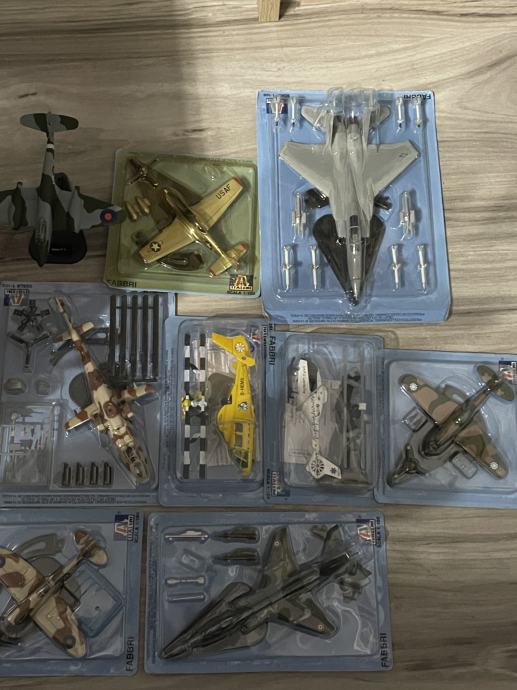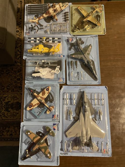Prodajem metalne modele aviona i helikoptera od renomiranog proizvođača FABRI u mjerilu 1:100. U setu se nalazi 9 modela borbenih aviona i helikoptera kao i civilnih helikoptera. Modeli su rađeni od visokokvalitetnih materijala tehnologijom visokotlačnog lijevanja. Cijena seta je 120 EUR. Svi modeli su novi zapakirani u top stanju