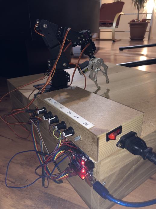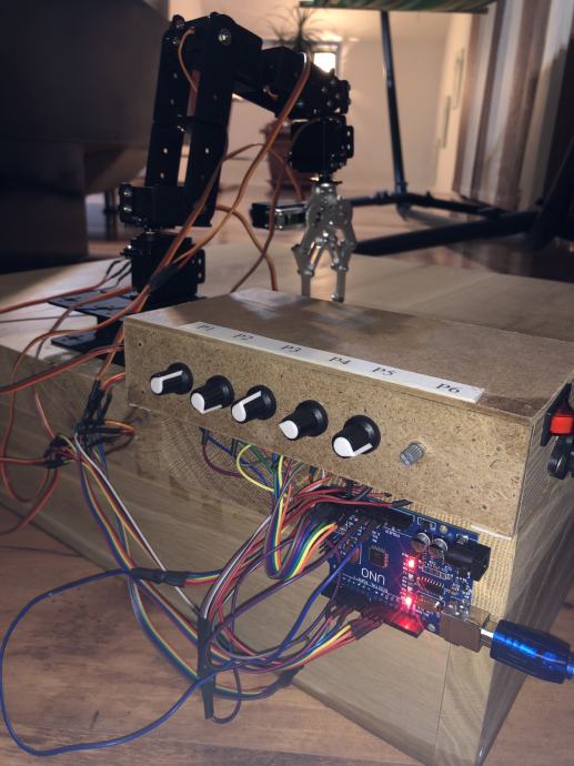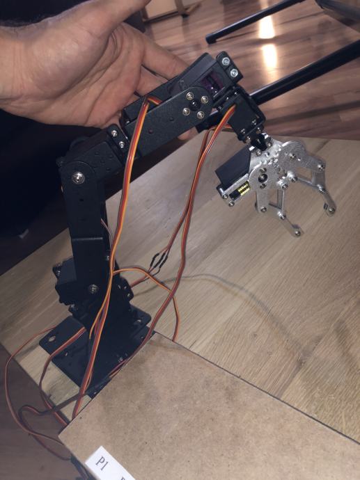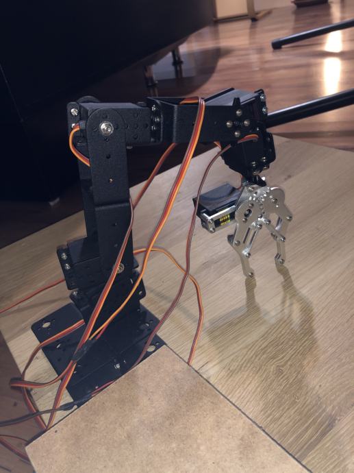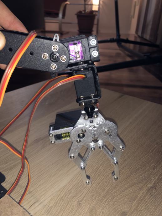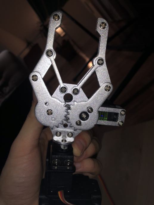 Robotska ruka odnosno manipulator je sastavljen od L i U nosača te multifunkcionalnih okvira za servo motore, 6 ''MG 996R'' servo motora koji mogu podržati do 10 kila zakretnog momenta seta produženih žica koje su zalemljene te potpuno izolirane, 6 potenciometara za regulaciju položaja, arduino pločice, ispravljača napona od 5V te prekidača za kompletno paljenje i gašenje robota iz pogona.