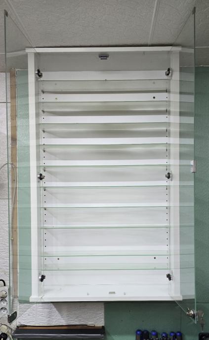 Vitrina je u potpunosti očuvana,treba još malo prašinu obrisati osobito s polica . Polica ima 10 komada od stakla dimenzije polica su 63 cm x 12 cm .