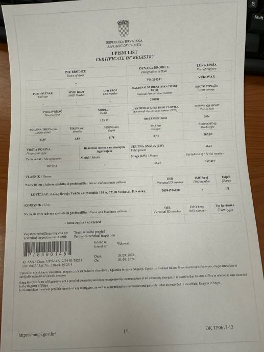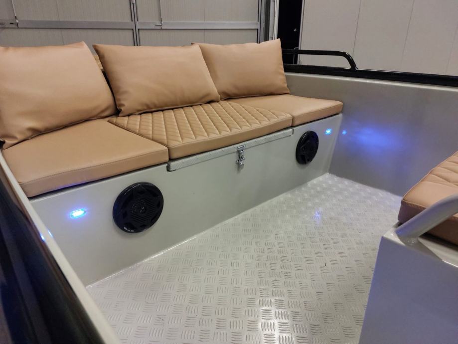 Kategorija C, područje plovidbe III.a. Motor rabljeni,generalno sreðen. (dajemo garanciju na motor godinu dana). Muzika, navigacijska svjetla, tank 100l.