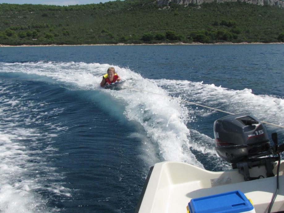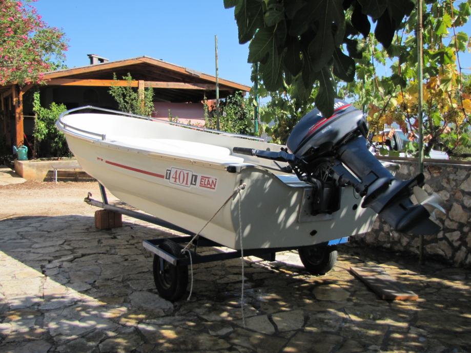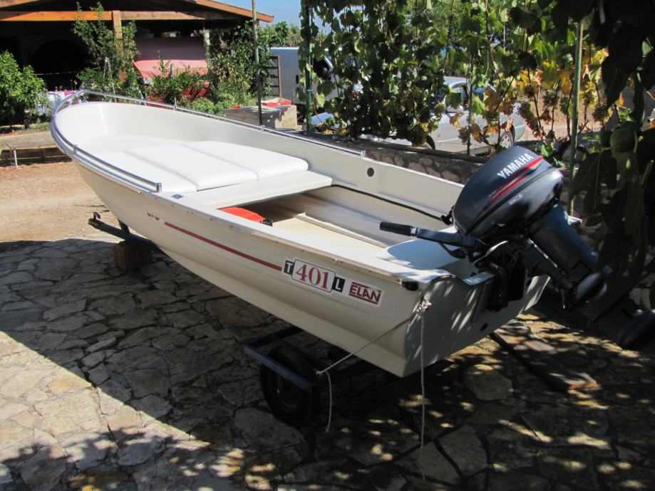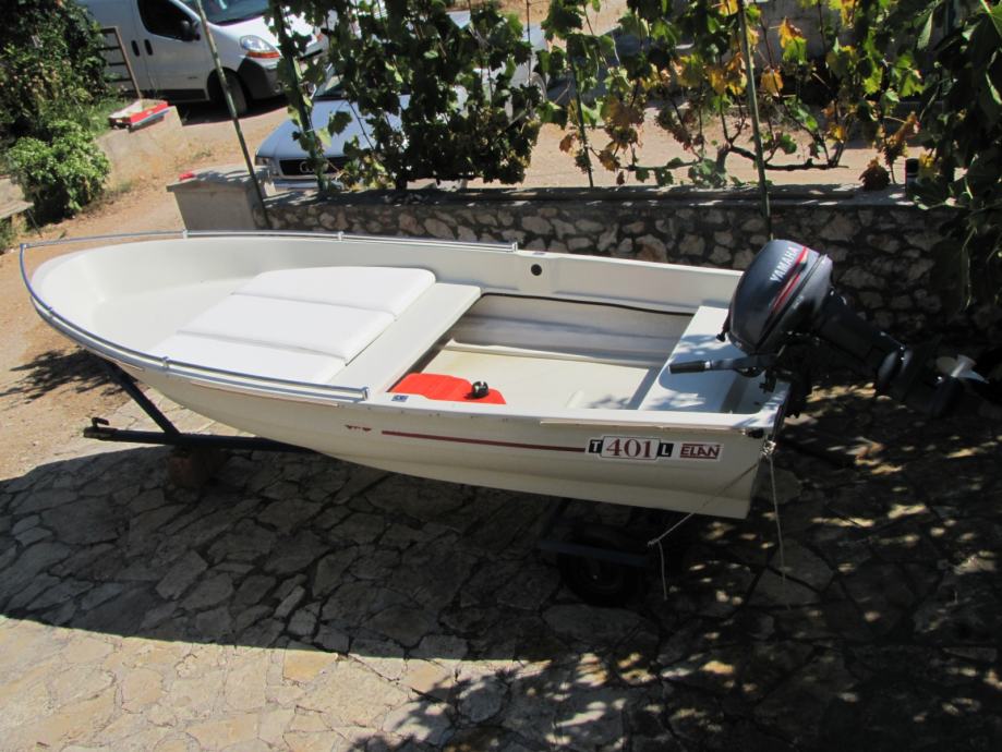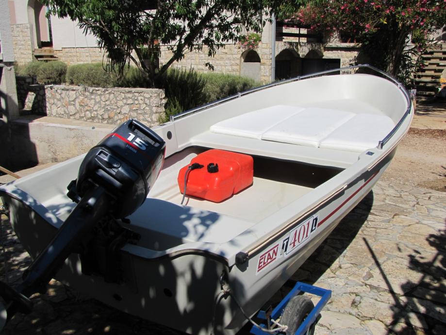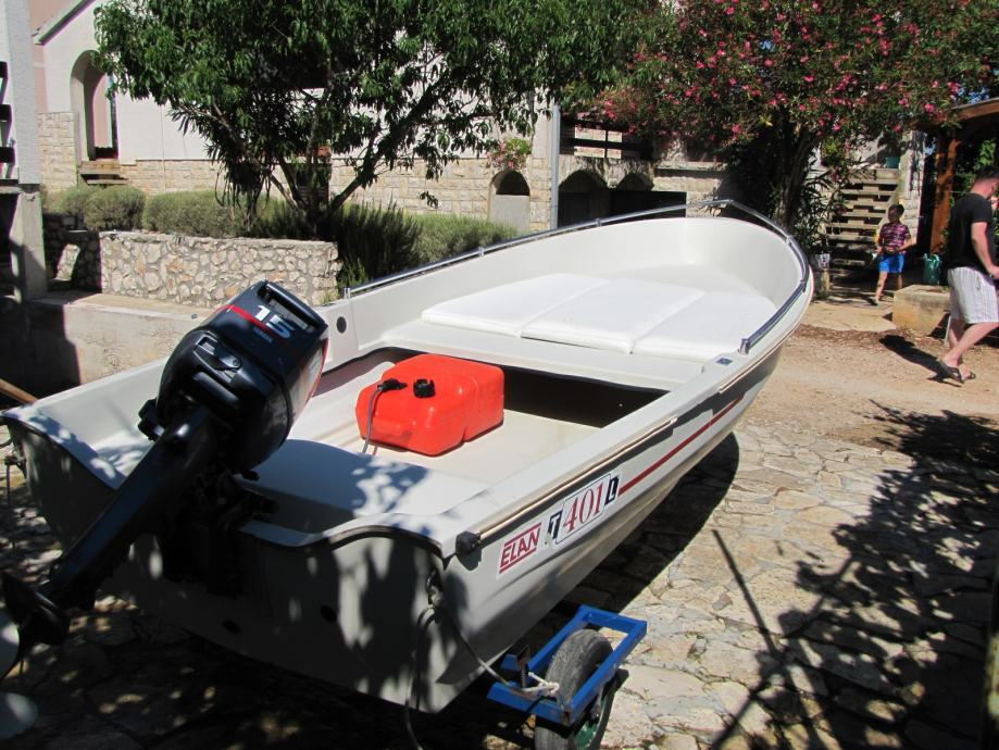 Prodajem Elan 401 sa Yamahom 15ks 2t, trajno registriran. Čamac je u dobrom stanju vožen 2 tjedna u sezoni. Na čamac je dodatno postavljena inox ograda i tapecirano sunčalište. Motor ima malo sati rada i redovno je održavan u Yamahinom servisu u Zagrebu (Sibeg). Čamac se nalazi na otoku Pašmanu kod Zadra i ima prikolicu kućne proizvodnje samo za prebaciti do mora (nije za vuču po cesti). Čamac je van sezone garažiran i zatvoren pod ceradom.
