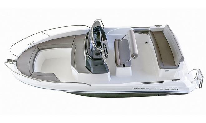 PRINCE 490 Open objedinjuje dva tipa plovila. To je prije svega kompaktni Open-gliser, ali i suvremeni fisherman s centralnom konzolom koji postiže veće brzine kad to poželite. To je mali-veliki PRINCE. Elegantan, jednostavan za upravljanje, ali povišen i sposoban za glisiranje. Cijena je povoljna. Pramčani dio kokpita ima inoks ogradu i uz pomoć dodatnih jastuka moguće ga je prenamijeniti u veliki prostor za sunčanje.