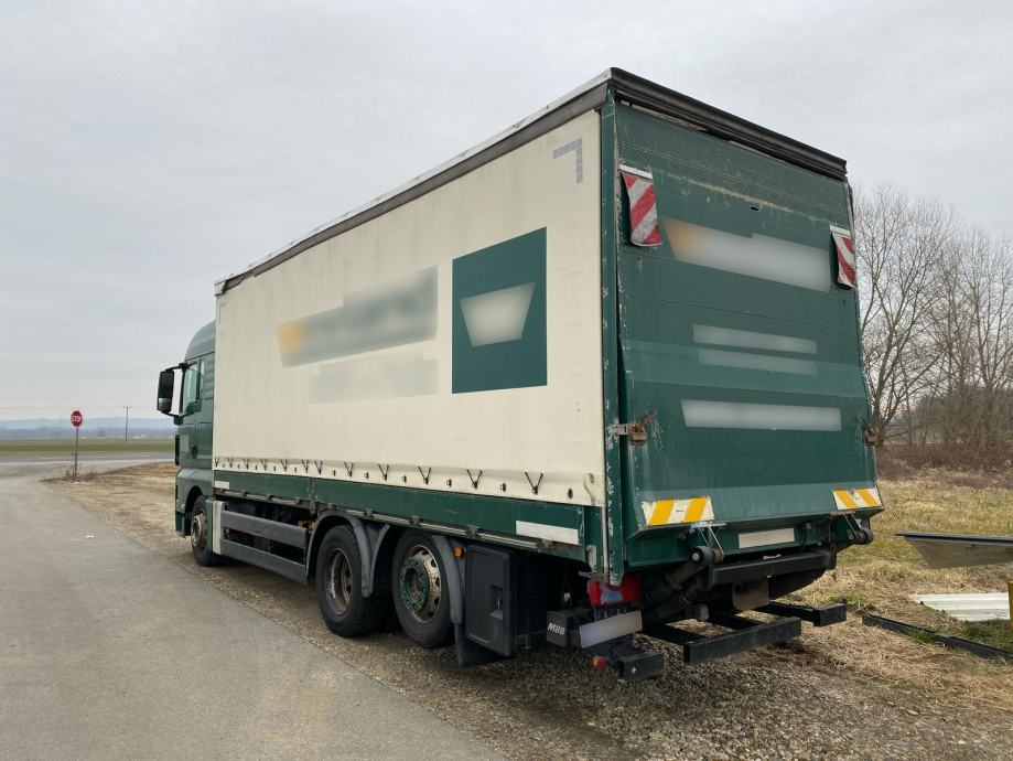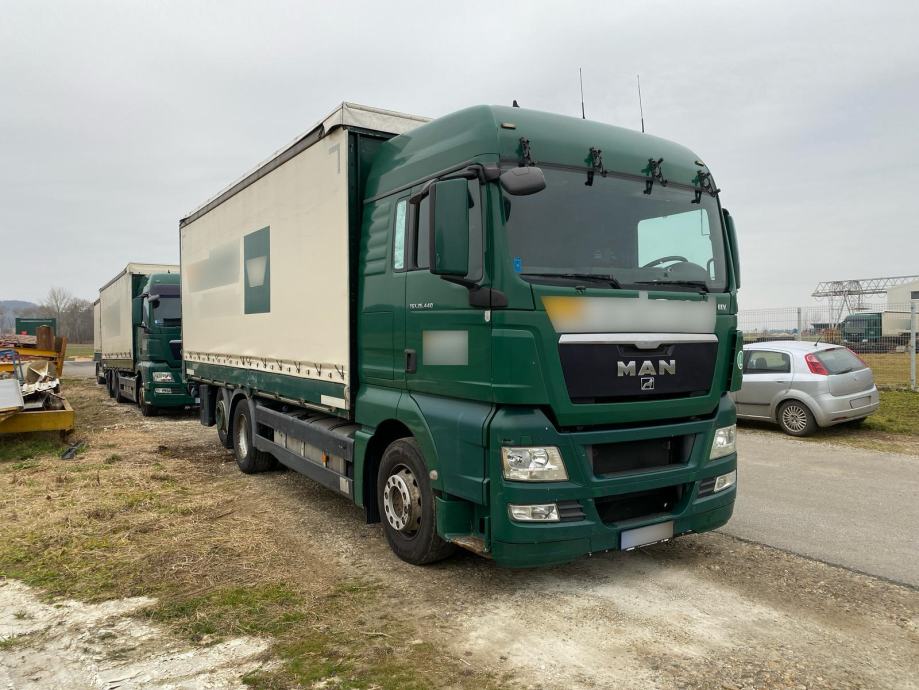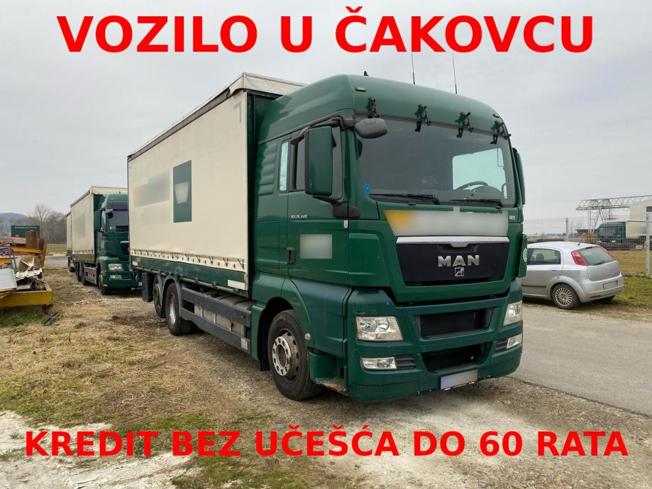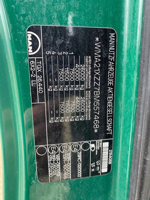 MAN TGX 26.440 EEV 6x2 EEV, u prometu od 01/2011, Euro5, ABS, EBS, full zračni ovjes, retarder, ručni mjenjač, tempomat, klima, webasto, radio CD, klizna cerada, aluminijske bočne stranice, utovarna rampa MBB/Palfinger 2000 K, nosivosti 2.000 kg, spavaća kabina, frižider, kutije za alat, kuka za prikolicu, rezervni kotač, NDM 26.000 kg, masa praznog vozila: 11.240 kg, nosivost: 14.685 kg, gume: 315/70 R22,5.