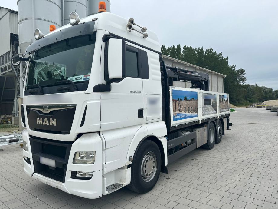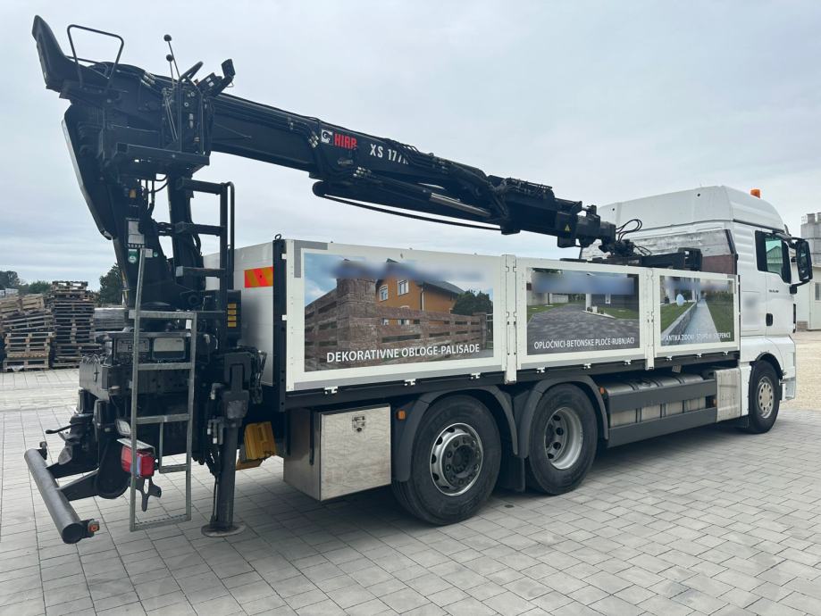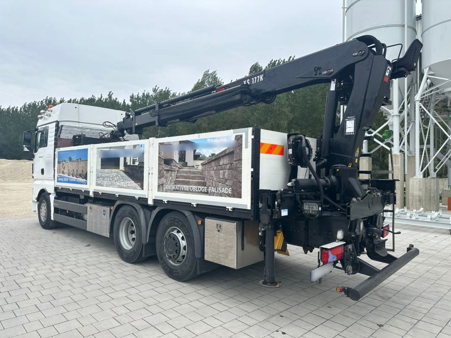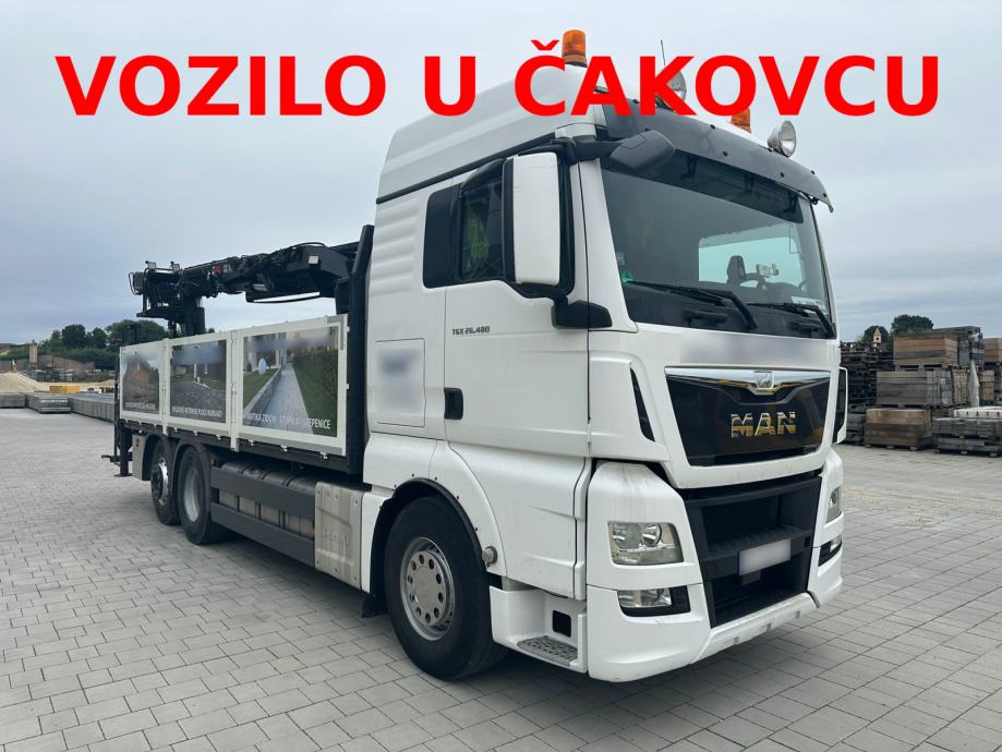 MAN TGA 26.480, 6x2, u prometu od 04/2016, Euro6, ABS, retarder, automatik, tempomat, spavaća kabina, klima, webasto, frižider, radio CD, kran HIAB 177 K PRO/HIPRO, kuka za prikolicu, NDM 26.000 kg, masa praznog vozila 13.875 kg, nosivost 12.125 kg, gume: 385/65 R22,5 ; 315/80 R22,5.
