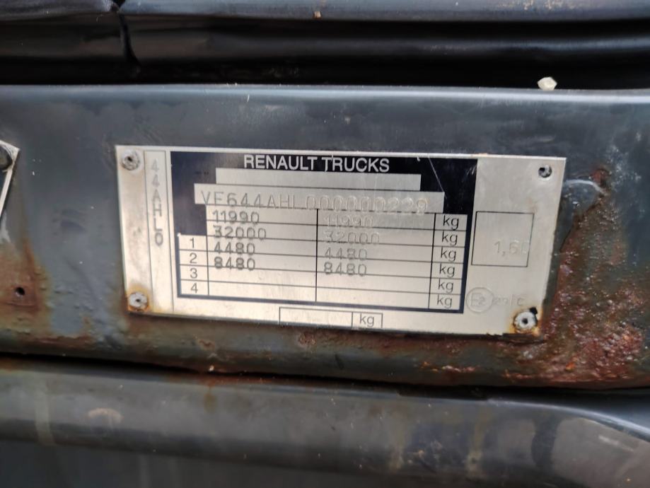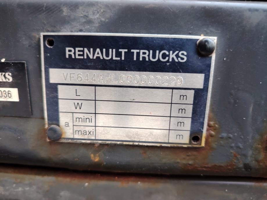 Renault Midlum 280.12, 4x2, u prometu od 11/2006, Euro 4, jastuci straga, ručni mjenjač, analogni taho, 2 sjedala, klima, utovarna rampa Dautel, nosivosti 1.000 kg, rezervni kotač, kutija za alat, dimenzije tovarnog prostora DxŠxV: 7.500 mm x 2.480 x mm 2.350 mm, NDM 11.990 kg, masa praznog vozila 6.970 kg, nosivost 5.020 kg, gume 245/70 R19,5. VIN: VF644AHL000000229