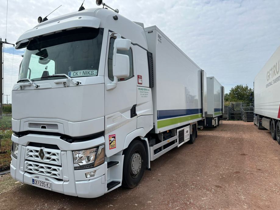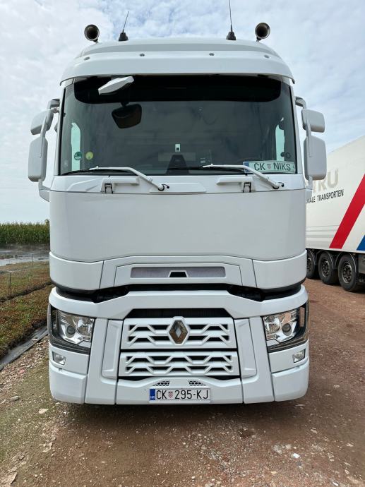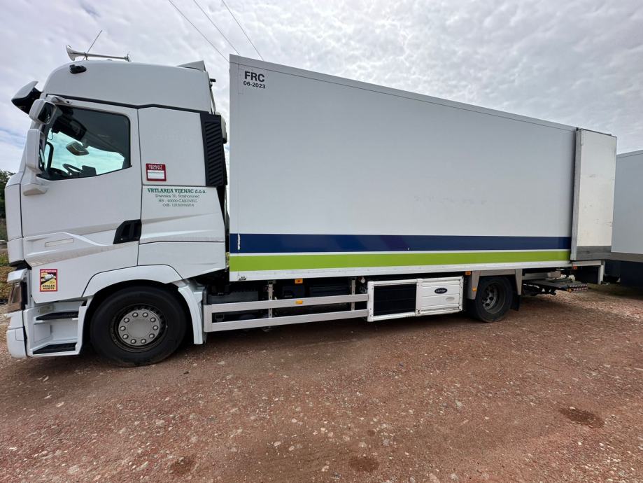 Kamion Renault T HIGH seria 2014. god., 4x2 konfiguracija, 820tkm, frigo (Carrier) 7,5x2,49x2,6m, utovarna rampa dhollandia, u kombinaciji sa prikolicom frigo (Carrier)7x2,49x2,6m, gume kamion volan 60%, pogon 100%(nove), prikolica 90%. Prelaz iz kamiona u prikolicu.