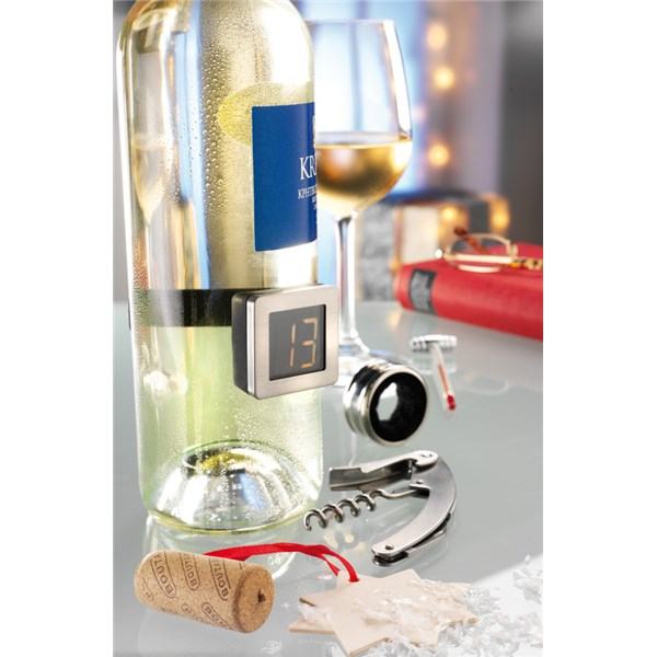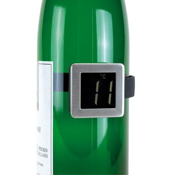 Servirajte vino ohlađeno na savršenu temperaturu! S ovim praktičnim termometrom s plastičnim držačem i automatskim uključivanjem ili isključivanjem kada se stavlja,ili skida s boce. Dimenzije 7,3 x 7,2 x 4 cm, težina 0.061 kg. Baterijsko upravljanje: Tip LR44 (baterija uključena).