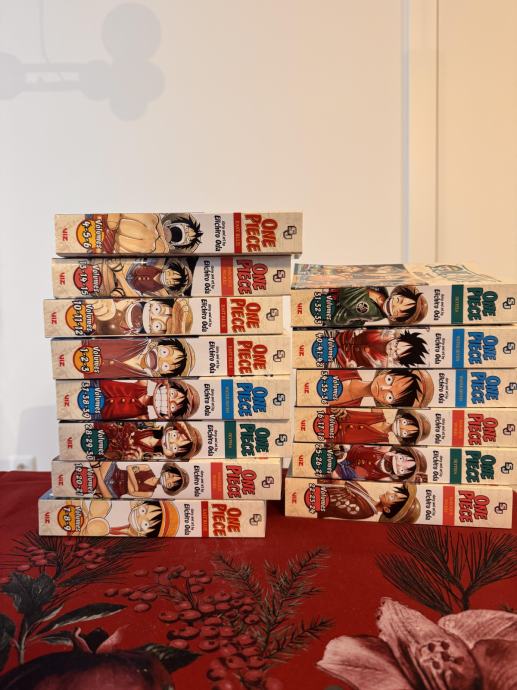 One Piece knjige od 1 do 42. Svaka knjiga se sastoji od 3 Volumesa. Jedna knjiga je 12€, cijeli komplet od 14 knjiga je 150€