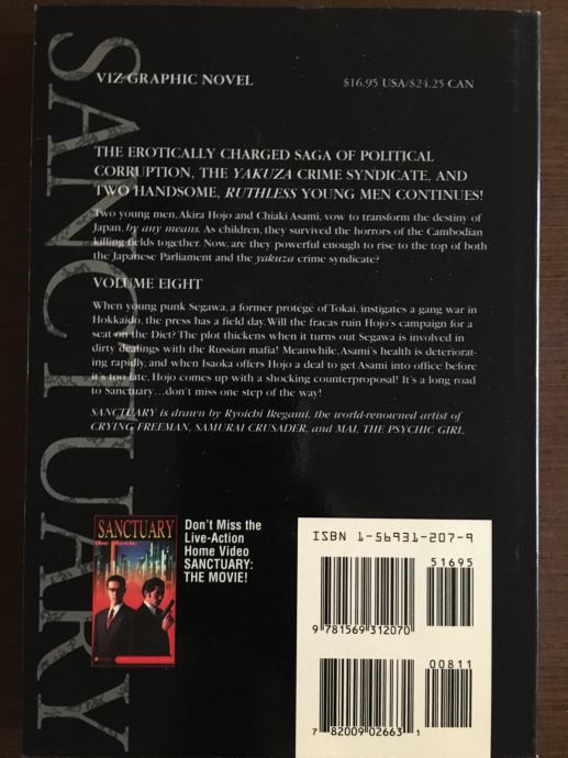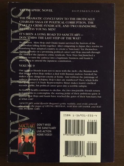 Sanctuary (Japanese: サンクチュアリ, Hepburn: Sankuchuari) is a manga written by Sho Fumimura, and illustrated by Ryoichi Ikegami. Sanctuary is a story that featured two childhood friends, Akira Hojo and Chiaki Asami, who ruthlessly struggle to set a new paradigm of living in Japan. However, the two friends take radically different paths (playing rock-paper-scissors to decide their roles): Akira chooses the dark path and joins a Yakuza gang, while Chiaki strives to become the youngest member of the Japanese Diet. As survivors of the Cambodian killing fields, the two characters develop an unmatched aggression and survival instincts, helping them to achieve their common ultimate goal: making Japan their own sanctuary. The story starts with Hojo as a minor mob boss and Asami as a political advisor. The plot first focuses on their rise to positions of greater power. Hojo's rise is decidedly quicker than Asami's, whose struggle to get to the top lasts the entire manga. Hojo is a Yakuza Don by book 2. The story then follows his attempts to gain control over the entire Yakuza while secretly paving the way for them to become a legitimate enterprise. Asami, meanwhile, must try to enter the Diet by forming his own party that represents the younger people of Japan. He is constantly opposed by the current Dietmen, who are aging politicians intent on holding onto power (often considered to be a thinly-veiled reference to the Liberal Democratic Party). y the end of the series, both Hojo and Asami succeed in their ambitions. Hojo successfully unites all of the major Yakuzas under his banner to extend the longevity of Yakuza (through educational reform) while Asami successfully becomes the youngest nominated politician to become Prime Minister of Japan. At the end of their journey, they return to where it all began: Cambodia. Unfortunately, Asami dies due to illness.