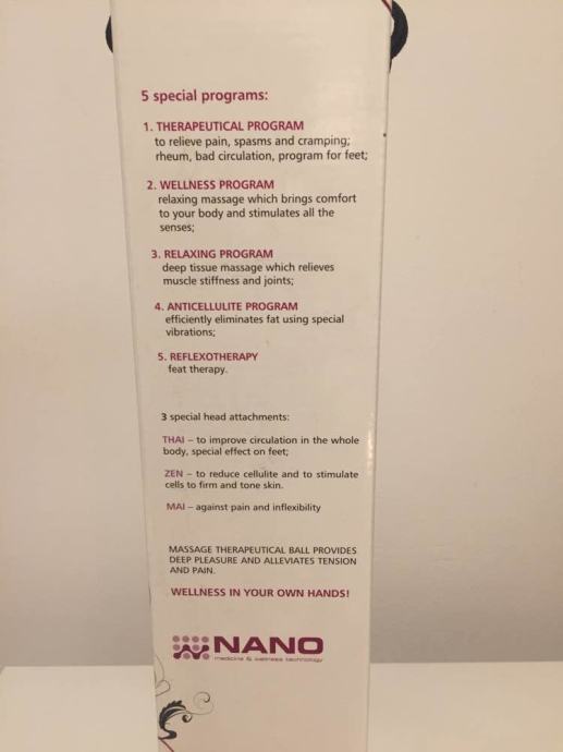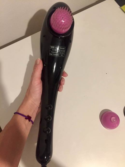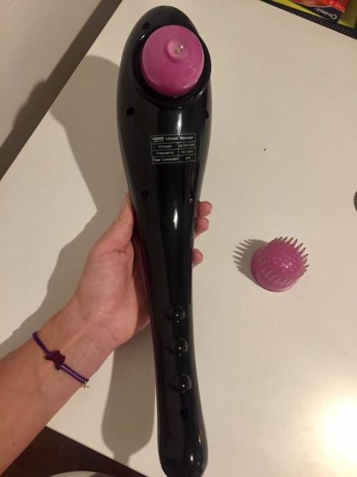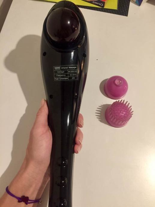 Masažer ima 3 nastavka: OKRUGLI (za bolove u leđima); S IZBOČINOM (za celulit i dubinsku masažu); SA SILIKONSKIM IGLICAMA (za stopala i vrat).