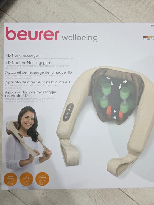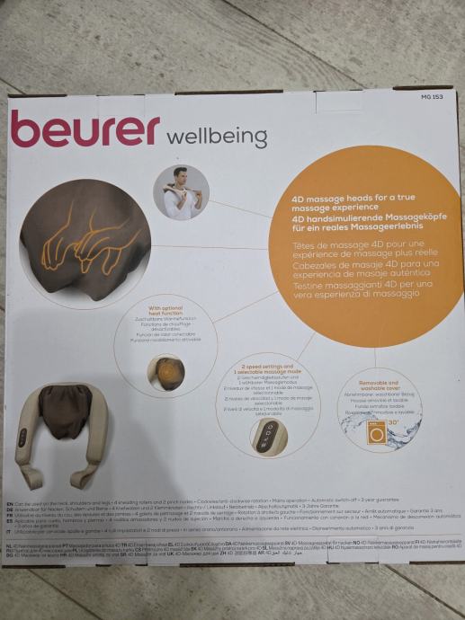 Prodajem novi masažer za vrat Beurer MG 153 4D iz linije Wellbeing. Radi se o masažeru koji se nosi oko vrata i ramena, s četiri 4D masažne glave koje imitiraju ručnu masažu. Ima 2 brzine i opciju grijanja, a navlaka je uklonjiva i periva. Uređaj se automatski isključuje nakon određenog vremena.