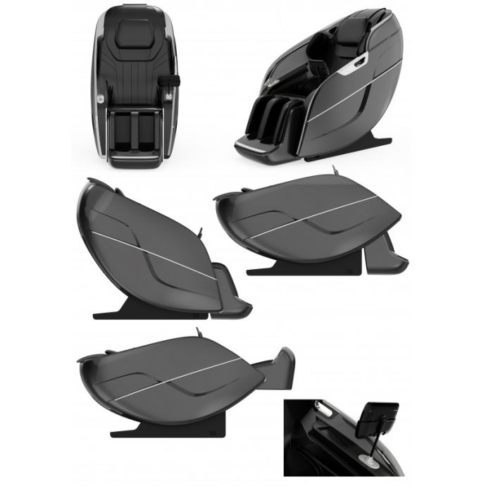Ova luksuzna masažna fotelja nudi 3D masaže s grijanjem valjaka, automatskim skeniranjem tijela, podesivim područjima i načinima masaže, uključujući gnječenje, shiatsu, tapkanje i masažu stopala valjkom. Ugrađeni Bluetooth zvučnici pružaju opuštajuće iskustvo.