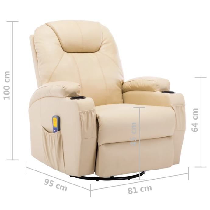 Tapecirana vrhunskom umjetnom kožom s debelim sjedalom i naslonom, ova je ljuljajuća masažna fotelja dizajnirana kako bi vam pružila vrhunsku udobnost. Fotelja za TV ima svoj zakretni sustav koji može pružiti 360 ° pogled na sobu. Ima 8 masažnih točaka kako bi okrijepio vaše cijelo tijelo. Zahvaljujući funkciji grijanja, naslonjač pruža ugodnu toplinu koja pomaže za ublažavanje napetosti. Naslon i oslonci za noge mogu se podesiti u različitim kutovima prema vašim potrebama. Uključeni daljinski upravljač može se sakriti u bočnom džepu masažne stolice.