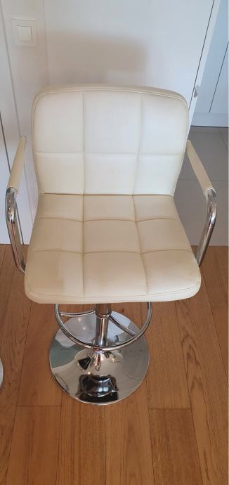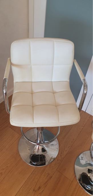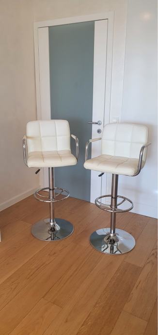 Prodajem dvije barske stolice Novel, od vještačke bijele kože,kupljene u Lesnini prije dvije godine. Stolice su u dobrom stanju, bez oštećenja, s nekoliko mrlja na koži od sunca. Visina od 92 do 113 cm je podesiva pomoću plinskog podizača, a max. nosivost je 120 kg. Udobnost osiguravaju praktični rukonasloni. Cijena po stolici je 250 kn.