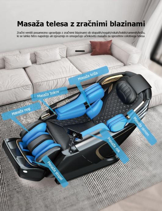Zračni ventili omogućuju pojedinačno upravljanje zračnim jastucima na stopalima, nogama, rukama, bokovima, ramenima i križu za potpuno opuštanje cijelog tijela.