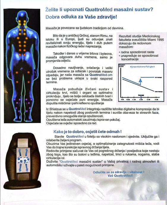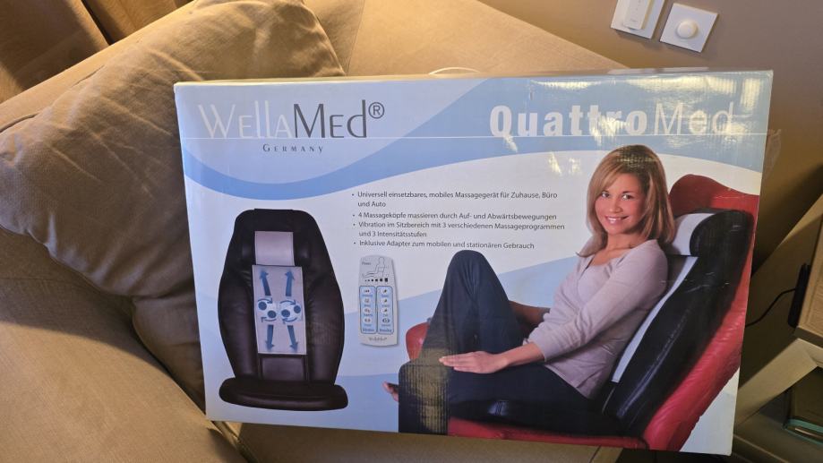 Prodajem potpuno novi, neupotrebljavani Quattromed masažer, svestrani uređaj koji pruža dubinsku masažu vrata, leđa i sjedišta.