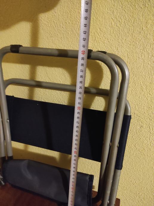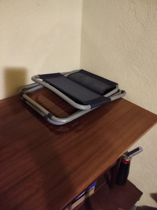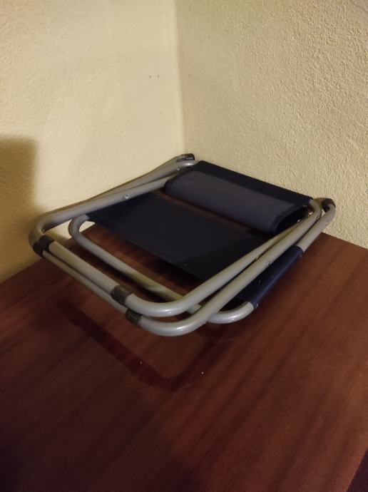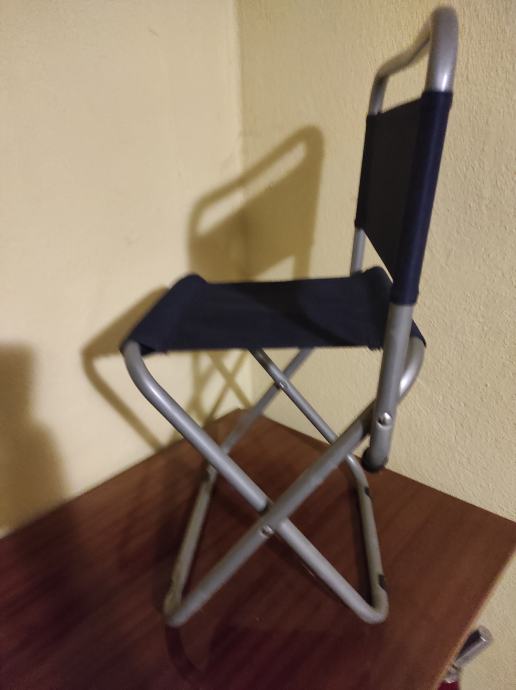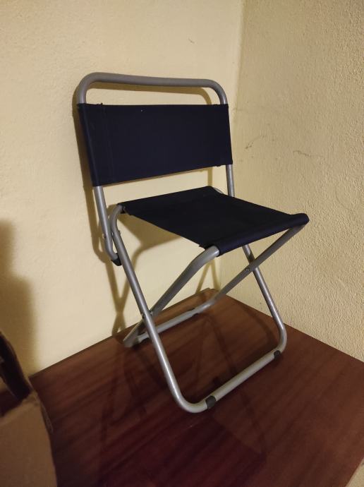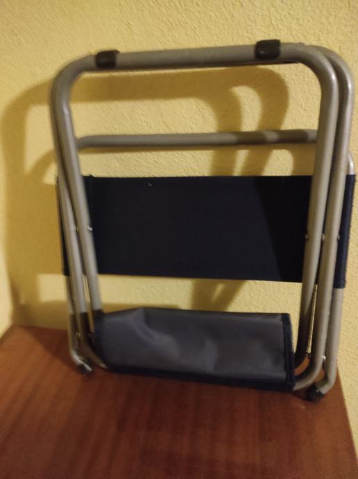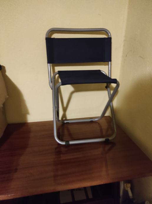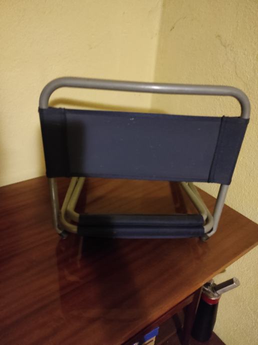 Mala stolica za kampiranje, planinarenje,pecanje,lov, koncert ili sveta misa ili bilo koji događaj na kojem je potrebno sjedenje,a posebno za starije osobe koje nemogu dugo stajati,a uz to stolica je jako lagana,svega jedan kilogram.Stolica je rasklopna,u jednom potezu se sklopi ili rasklopi,Siroka 35 cm,a visoka 52 centimetara,lagana za nositi i nikada koristena.Za sve informacije nazovite ili pošaljite upit na Viber ili njuskalo a saljem postom ili tiskom ili u dogovoru sa kupcem.Sve se vidi na slikama pa pogledajte slike.
