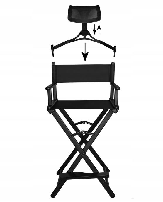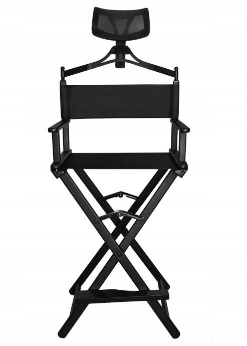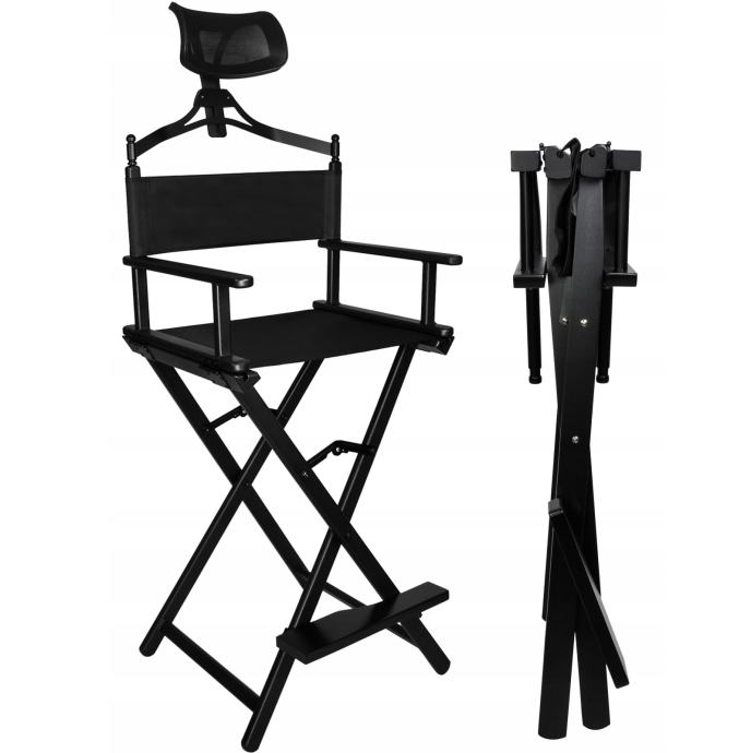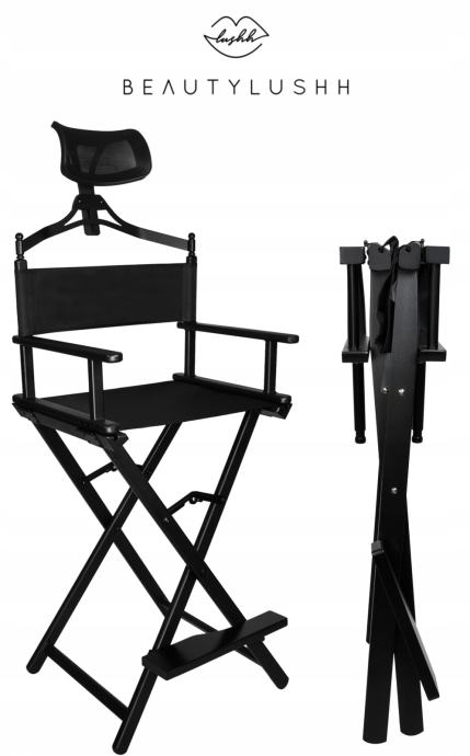 SKLOPIVI ŠMINKERNI STOL S JASTUKOM - Naša izuzetno čvrsta i udobna stolica za šminku, maskiranje i karakterizaciju glumaca, dobro će poslužiti i kao redateljska stolica. Izrađen je od crnog aluminija. Sjedalo je izrađeno od vodootpornog materijala Oxford 600D. Osim toga, stolica je opremljena udobnim jastukom koji dodatno povećava udobnost tijekom dugih sesija. Proizvod ima nosivost do 140 kilograma! Noge na dnu osiguravaju stabilnost i sigurnost tijekom korištenja.